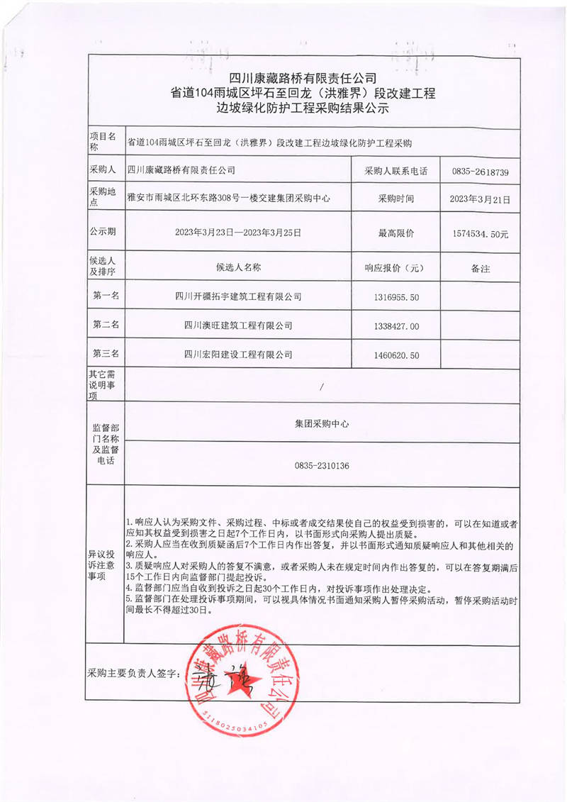 四川康藏路橋有限責(zé)任公司省道104雨城區(qū)坪石至回龍(洪雅界)段改建工程邊坡綠化防護(hù)工程采購(gòu)結(jié)果公示