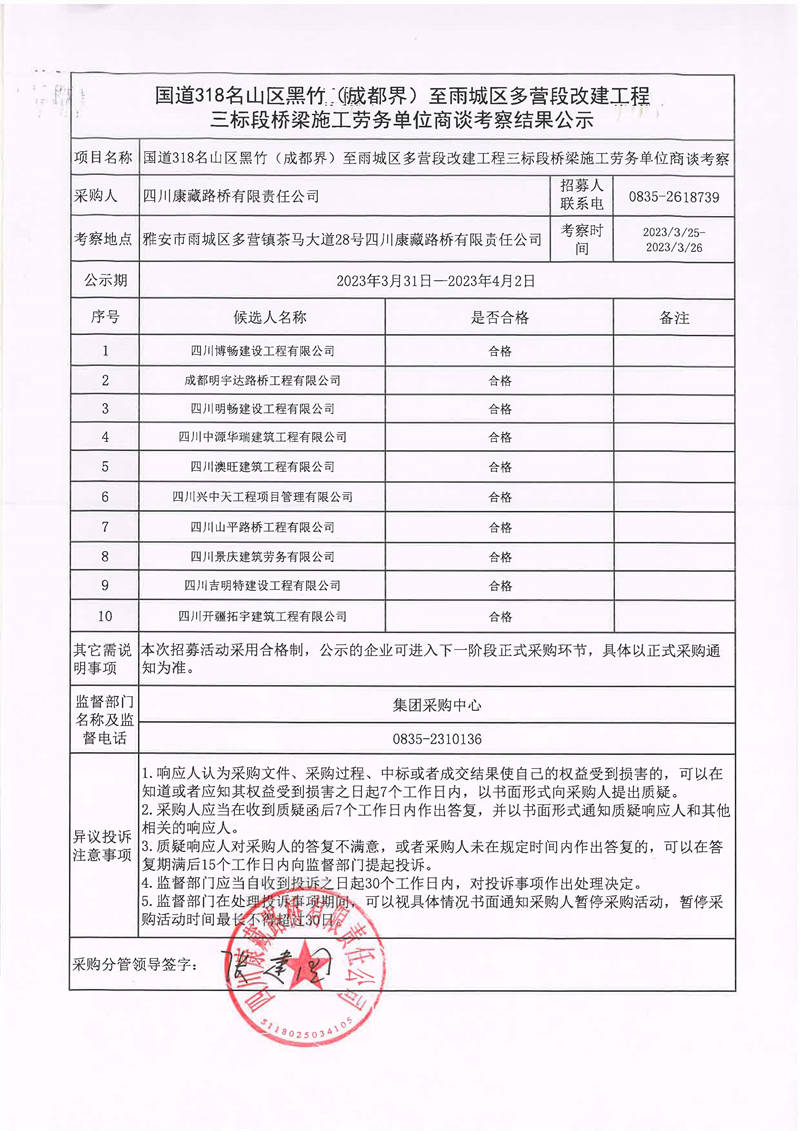 四川康藏路橋有限責任公司國道318名山區(qū)黑竹(成都界)至雨城區(qū)多營段改建工程三標段橋梁施工勞務單位商談考察結(jié)果公示