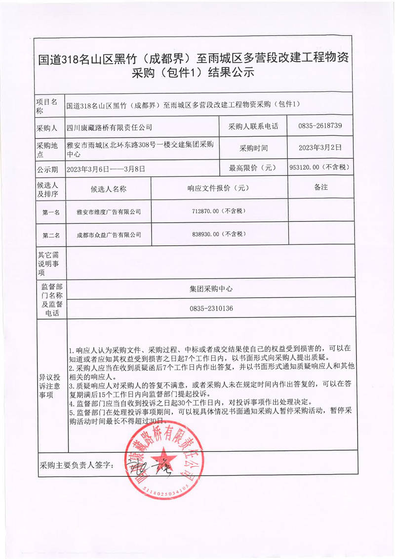 四川康藏路橋有限責任公司國道318名山區(qū)黑竹(成都界)至雨城區(qū)多營段改建工程物資采購(包件1)結(jié)果公示