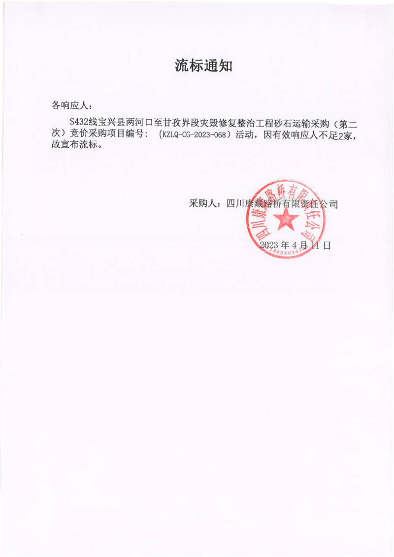 四川康藏路橋有限責(zé)任公司寶興分公司S432寶興縣兩河口至甘孜界段災(zāi)毀修復(fù)整治工程砂石運輸采購(第二次)流標通知
