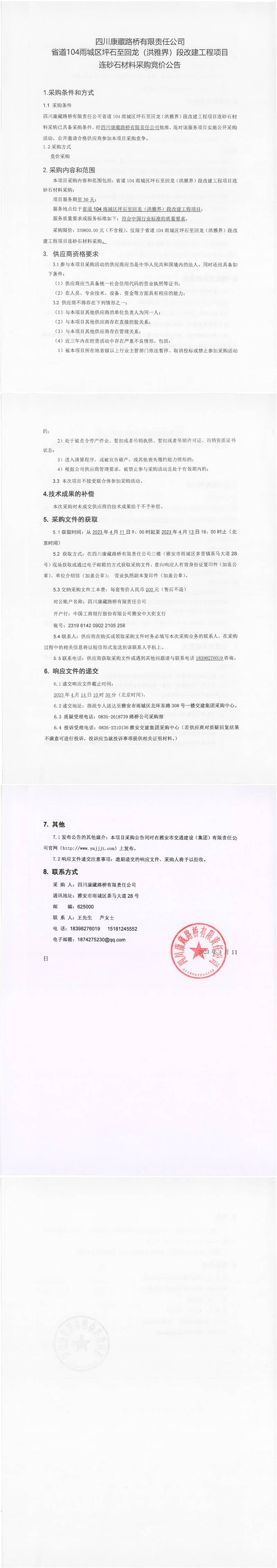 四川康藏路橋有限責(zé)任公司省道104雨城區(qū)坪石至回龍(洪雅界)段改建工程項(xiàng)目連砂石材料采購(gòu)競(jìng)價(jià)公告
