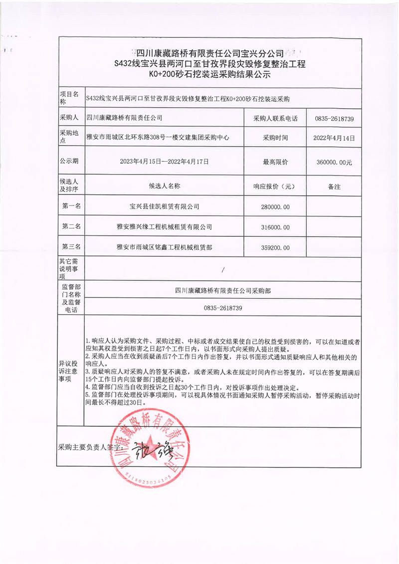 四川康藏路橋有限責任公司寶興分公司S432線寶興縣兩河口至甘孜界段災毀修復整治工程K0+200砂石挖裝運采購結(jié)果公示