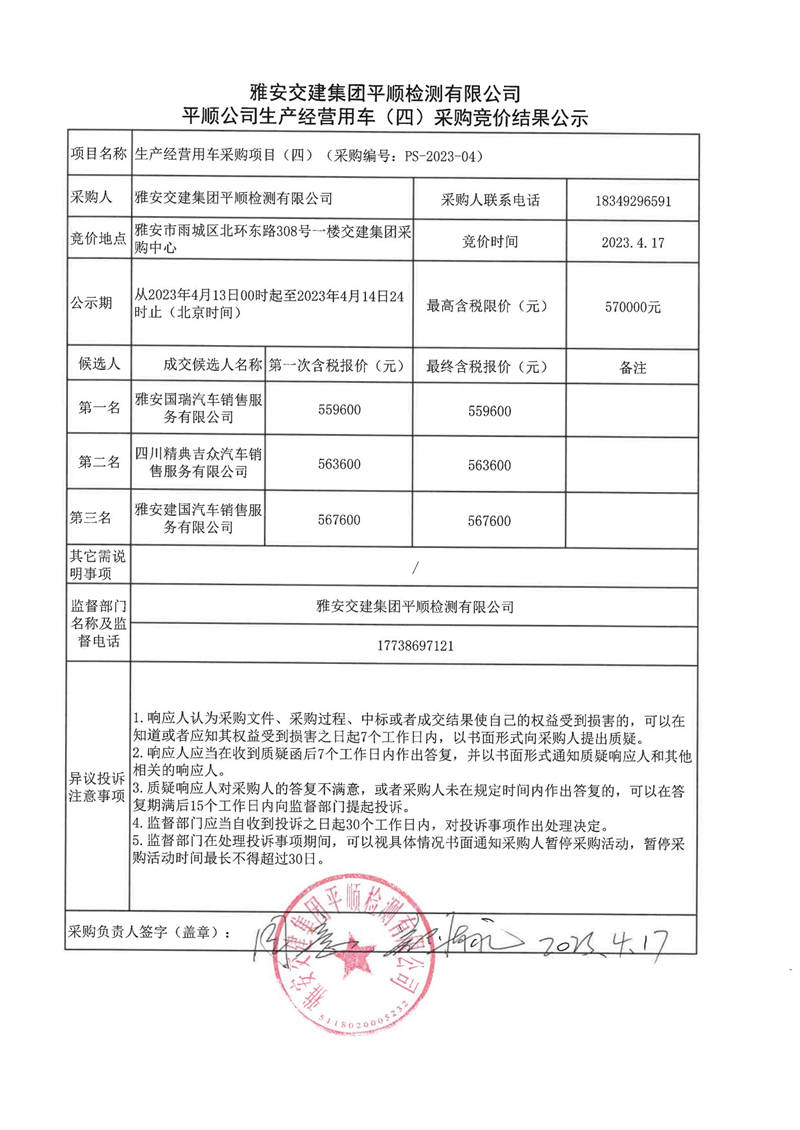 雅安交建集團(tuán)平順檢測有限公司平順公司生產(chǎn)經(jīng)營用車(四)采購競價(jià)結(jié)果公示