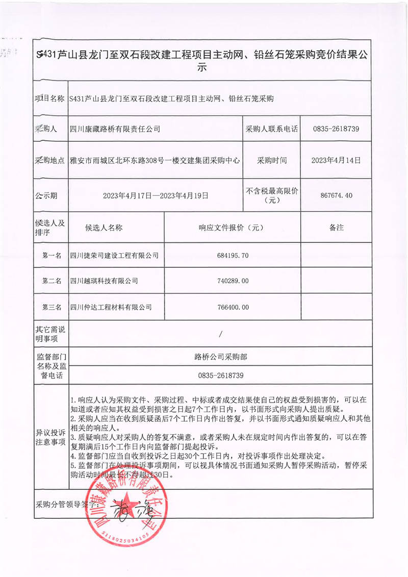 四川康藏路橋有限責(zé)任公司S431蘆山縣龍門至雙石段改建工程項目主動網(wǎng)、鉛絲石籠采購競價結(jié)果公示