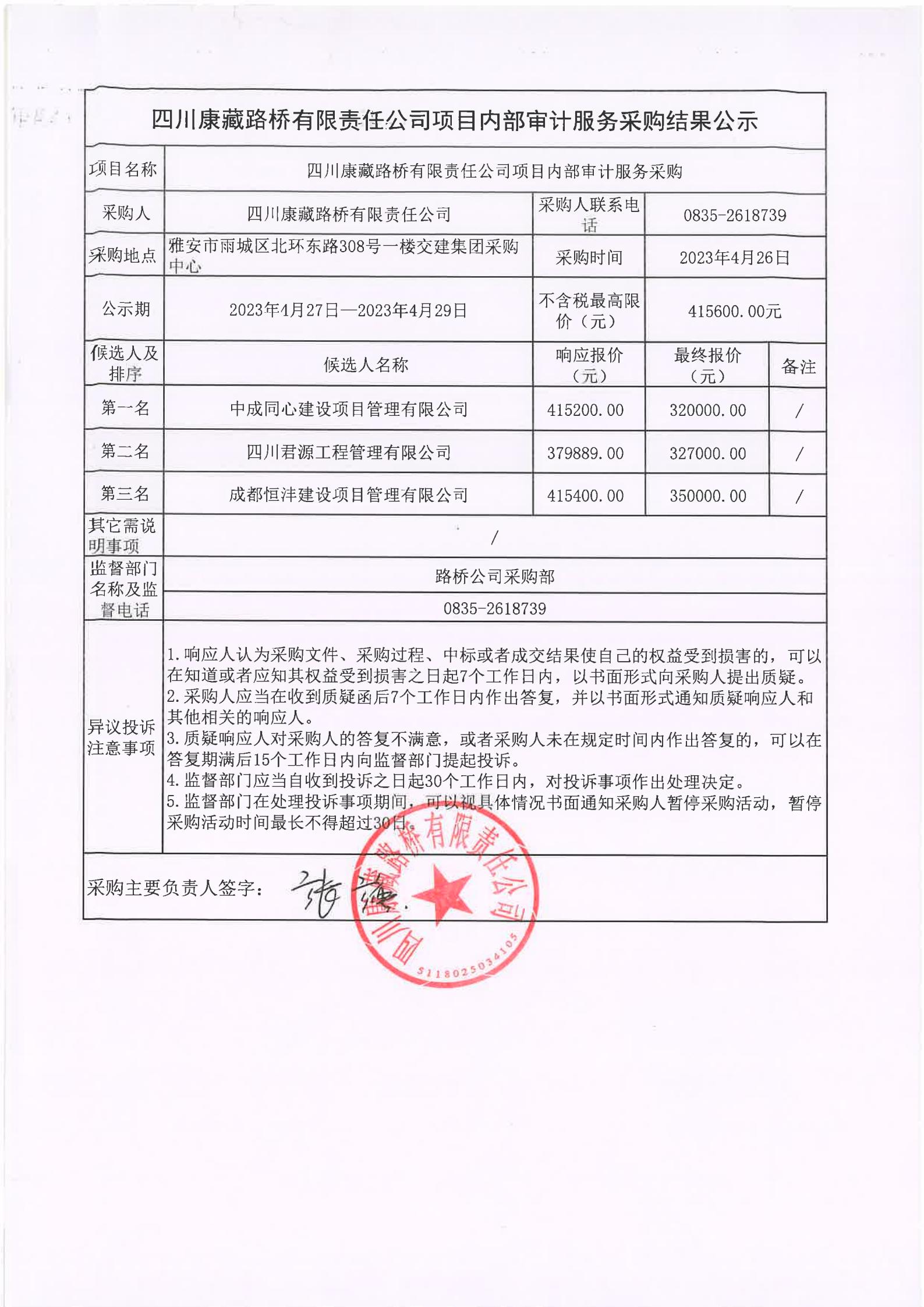 四川康藏路橋有限責(zé)任公司項(xiàng)目?jī)?nèi)部審計(jì)服務(wù)采購結(jié)果公示