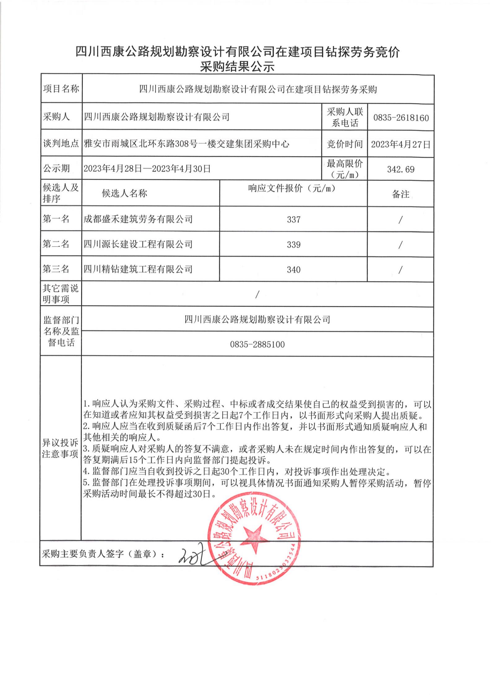 四川西康公路規(guī)劃勘察設(shè)計(jì)公司在建項(xiàng)目鉆探勞務(wù)競價(jià)采購結(jié)果公示