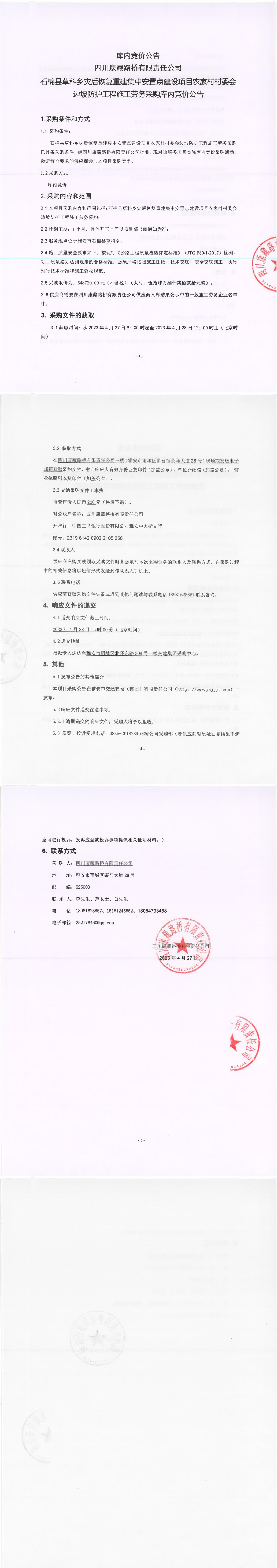 四川康藏路橋有限責(zé)任公司石棉草科鄉(xiāng)災(zāi)后恢復(fù)重建集中安置點(diǎn)建設(shè)項(xiàng)目農(nóng)家村村委會(huì)邊坡防護(hù)工程施工勞務(wù)采購(gòu)采購(gòu)庫(kù)內(nèi)競(jìng)價(jià)公告