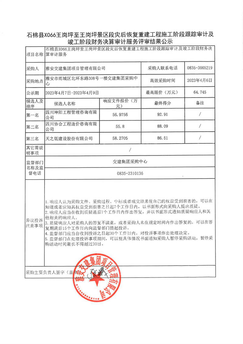 雅安交建集團(tuán)項(xiàng)目管理有限公司石棉縣X066王崗坪至王崗坪景區(qū)段災(zāi)后恢復(fù)重建工程施工階段跟蹤審計(jì)及竣工階段財(cái)務(wù)決算審計(jì)服務(wù)評審結(jié)果公示