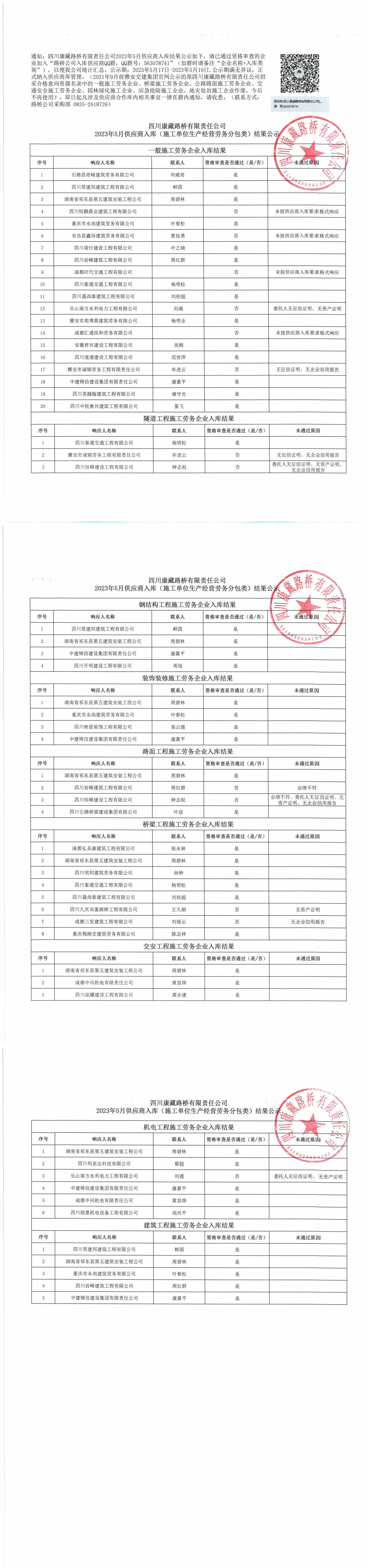 四川康藏路橋有限責任公司2023年5月供應商入庫(施工單位生產經營勞務分包類)結果公示