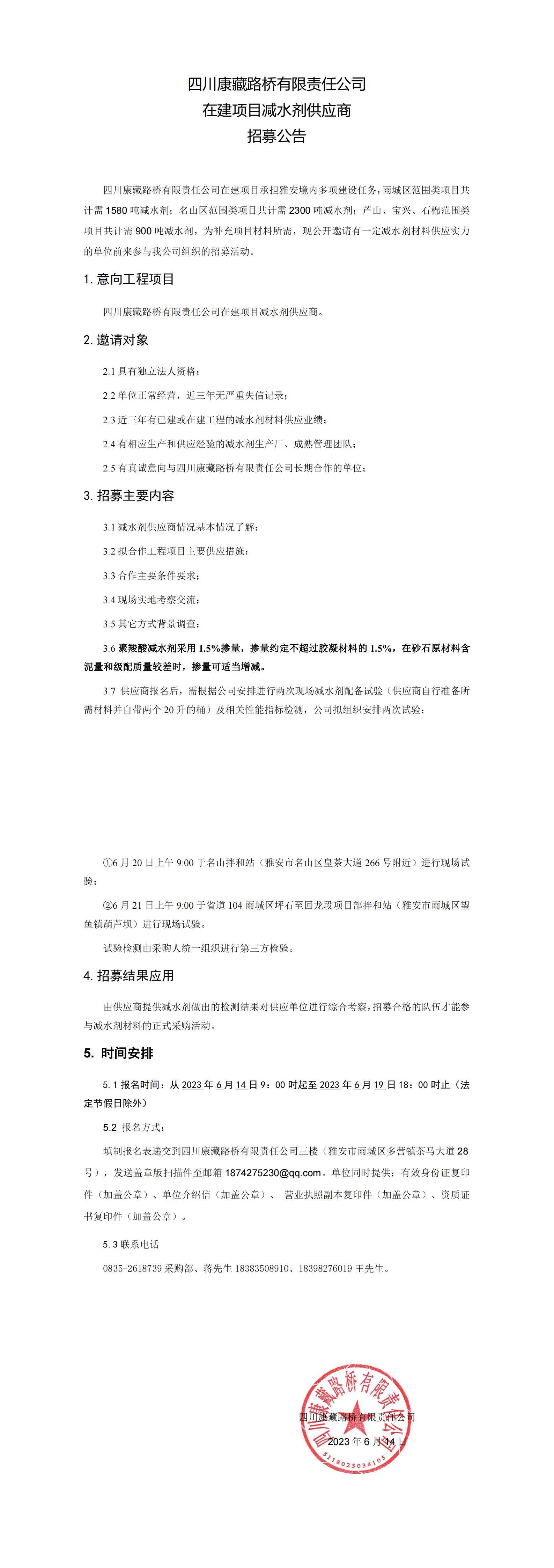 四川康藏路橋有限責(zé)任公司在建項(xiàng)目減水劑供應(yīng)商招募公告