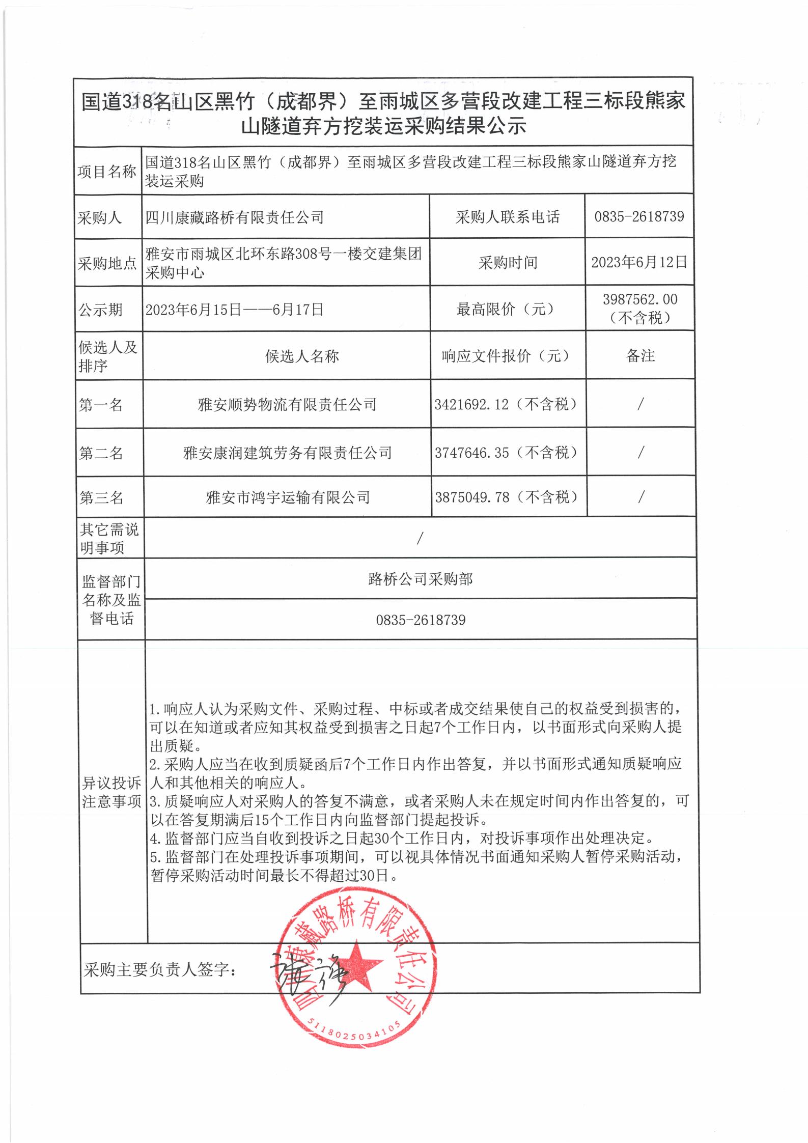四川康藏路橋有限責任公司國道318名山區(qū)黑竹(成都界)至雨城區(qū)多營段改建工程三標段熊家山隧道棄方挖裝運采購結(jié)果公示