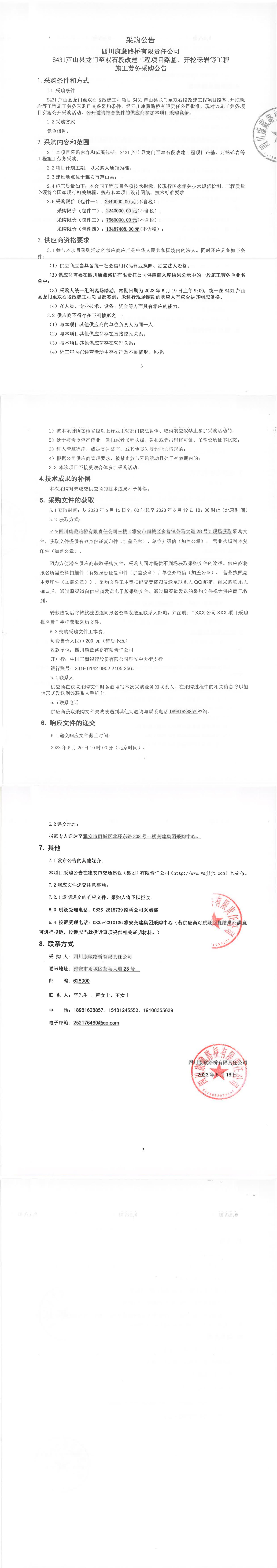 四川康藏路橋有限責(zé)任公司S431蘆山縣龍門(mén)至雙石段改建工程項(xiàng)目路基、開(kāi)挖礫巖等工程施工勞務(wù)采購(gòu)公告