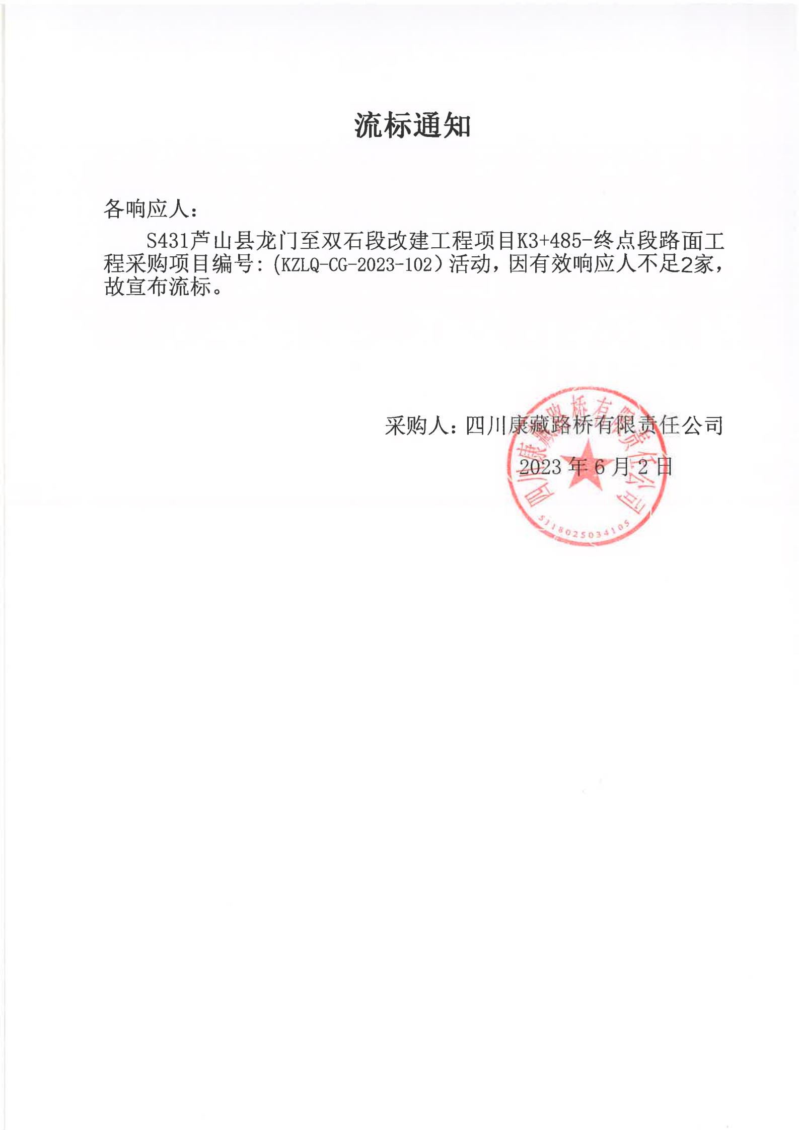 四川康藏路橋有限責(zé)任公司S431蘆山縣龍門至雙石段改建工程項目K3+485-終點段路面工程采購項目流標(biāo)通知
