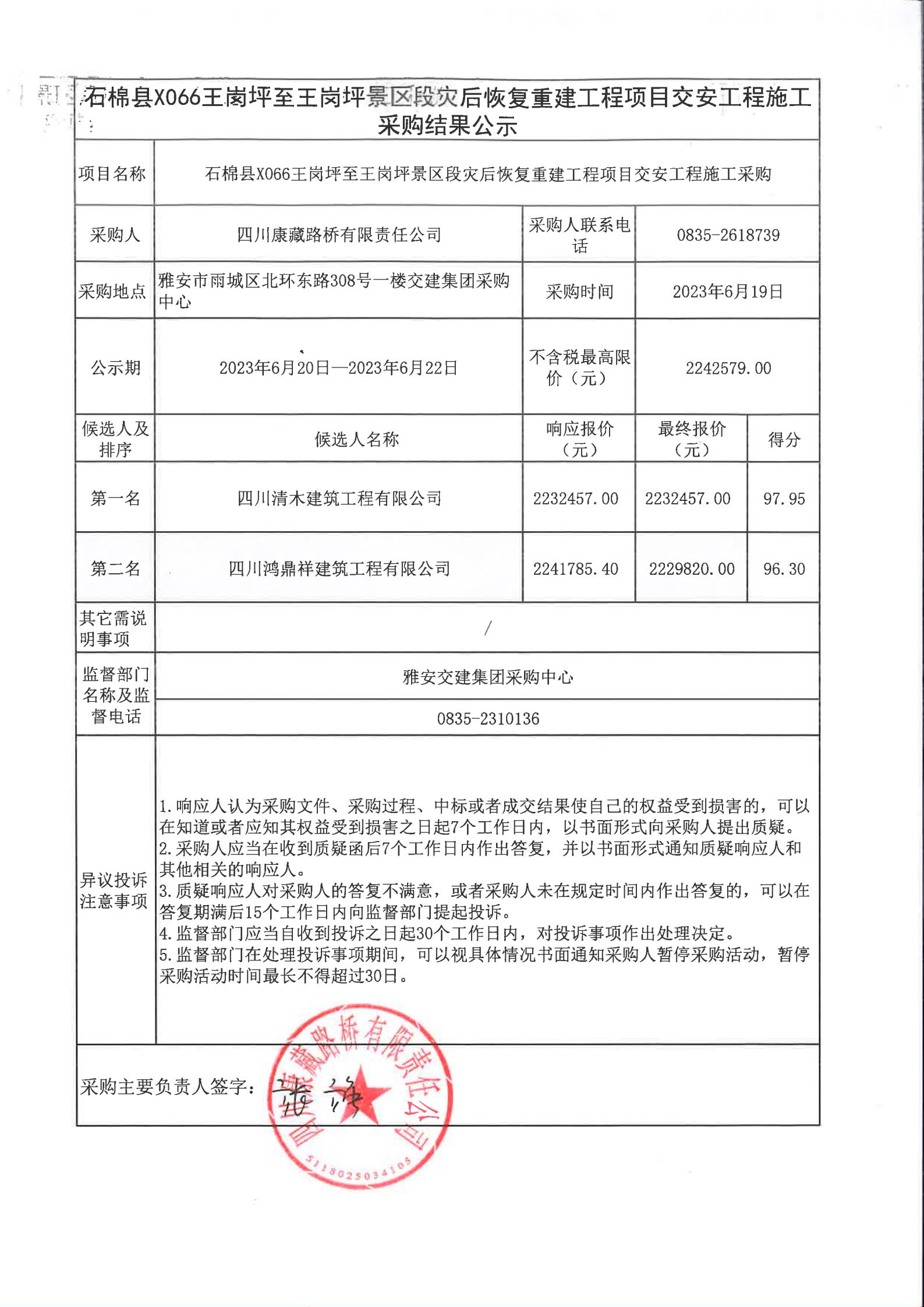 四川康藏路橋有限責任公司石棉縣X066王崗坪至王崗坪景區(qū)段災后恢復重建工程項目交安工程施工采購結(jié)果公示