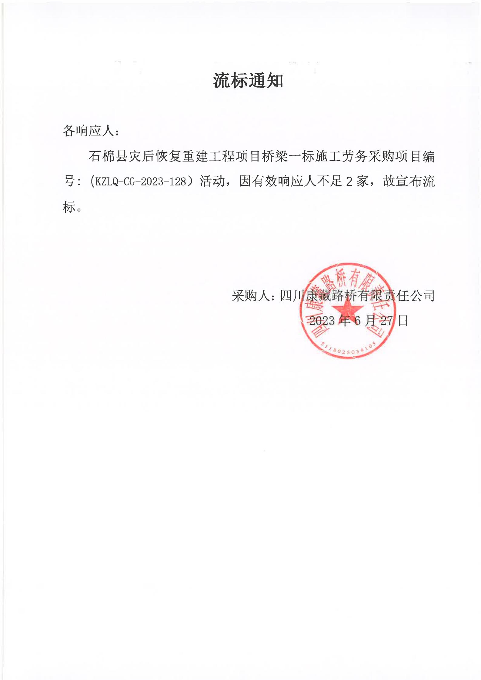 四川康藏路橋有限責(zé)任公司石棉縣災(zāi)后恢復(fù)重建工程項目橋梁一標(biāo)施工勞務(wù)采購流標(biāo)通知
