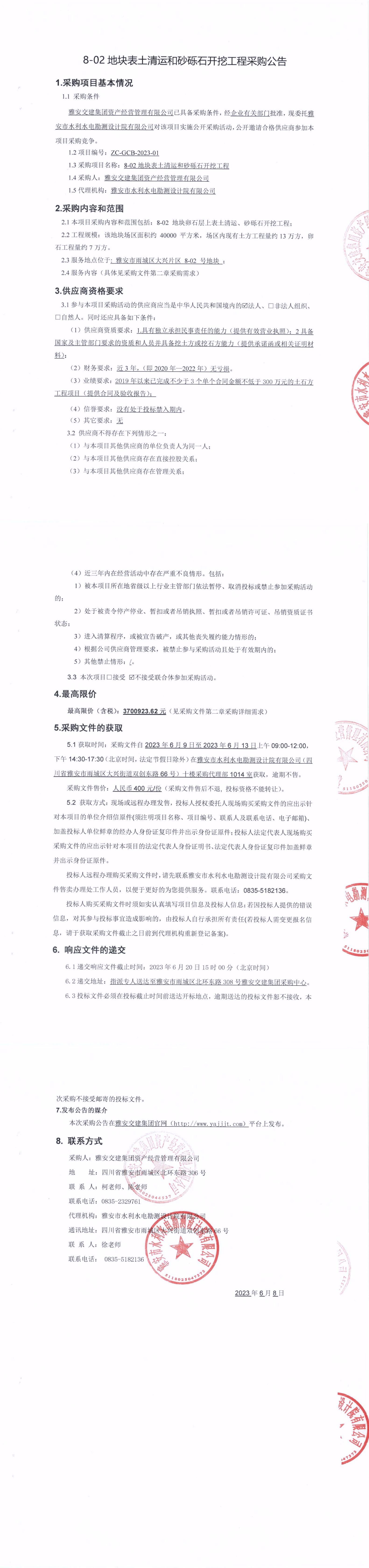 雅安交建集團(tuán)資產(chǎn)經(jīng)營(yíng)管理有限公司8-02地塊表土清運(yùn)和砂礫石開(kāi)挖工程采購(gòu)公告