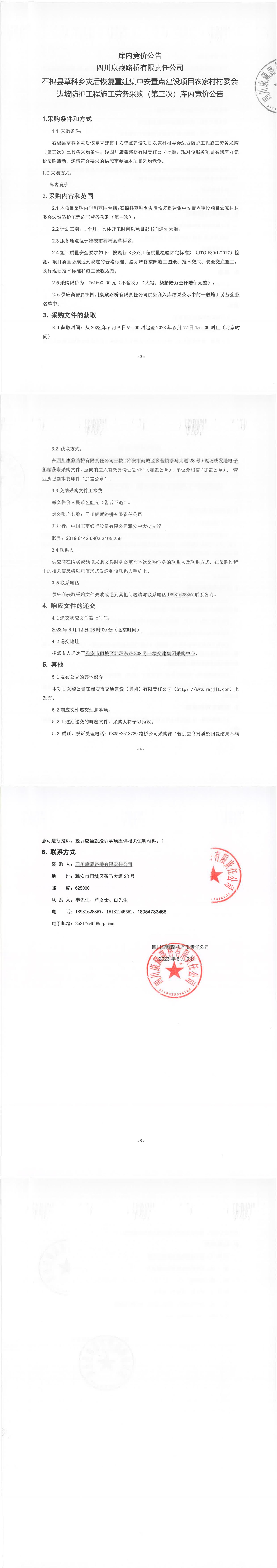 四川康藏路橋有限責(zé)任公司石棉縣草科鄉(xiāng)災(zāi)后恢復(fù)重建集中安置點建設(shè)項目農(nóng)家村村委會邊坡防護工程施工勞務(wù)采購(第三次)庫內(nèi)競價公告