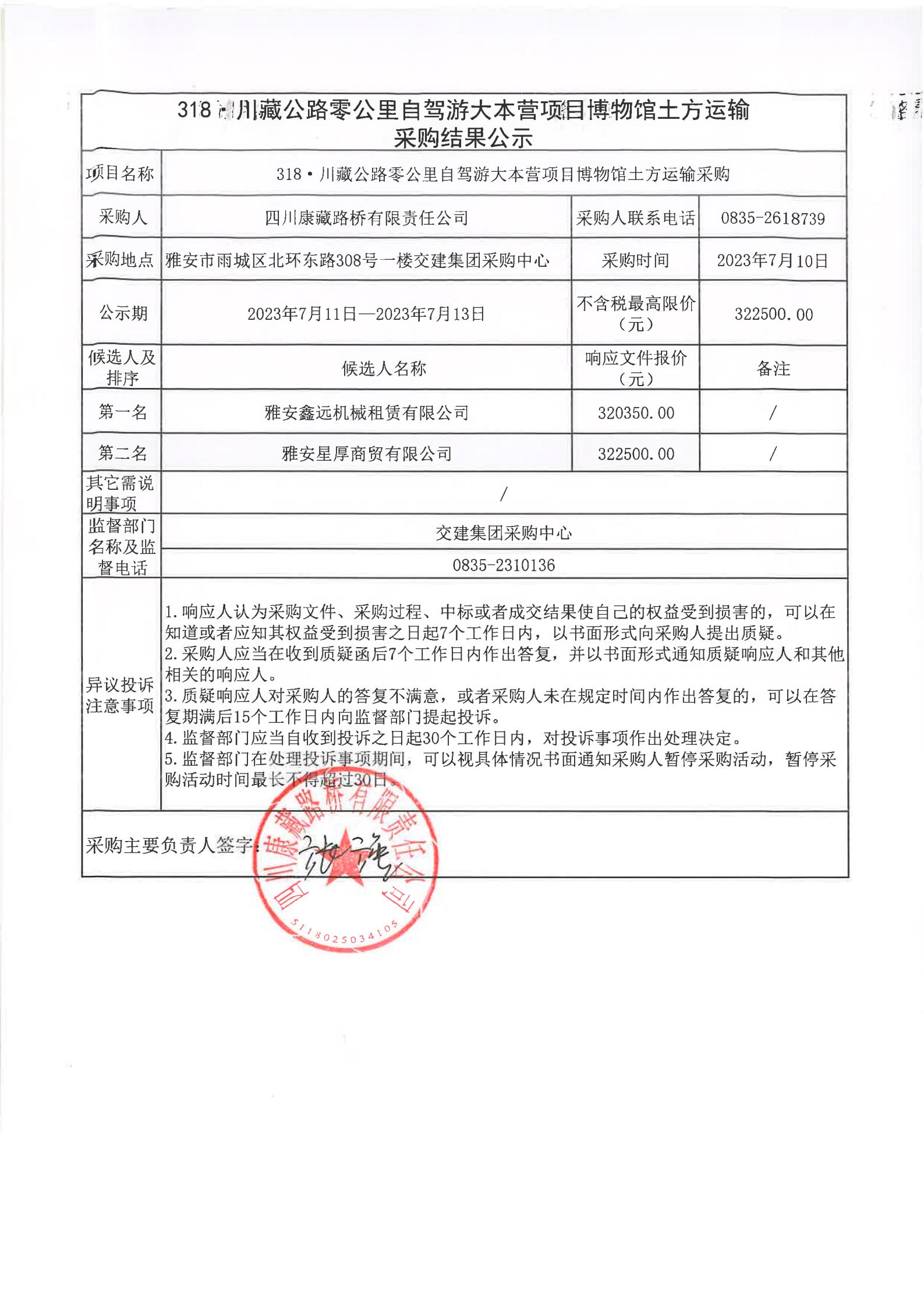 四川康藏路橋有限責(zé)任公司318·川藏公路零公里自駕游大本營(yíng)項(xiàng)目博物館土方運(yùn)輸采購(gòu)結(jié)果公示
