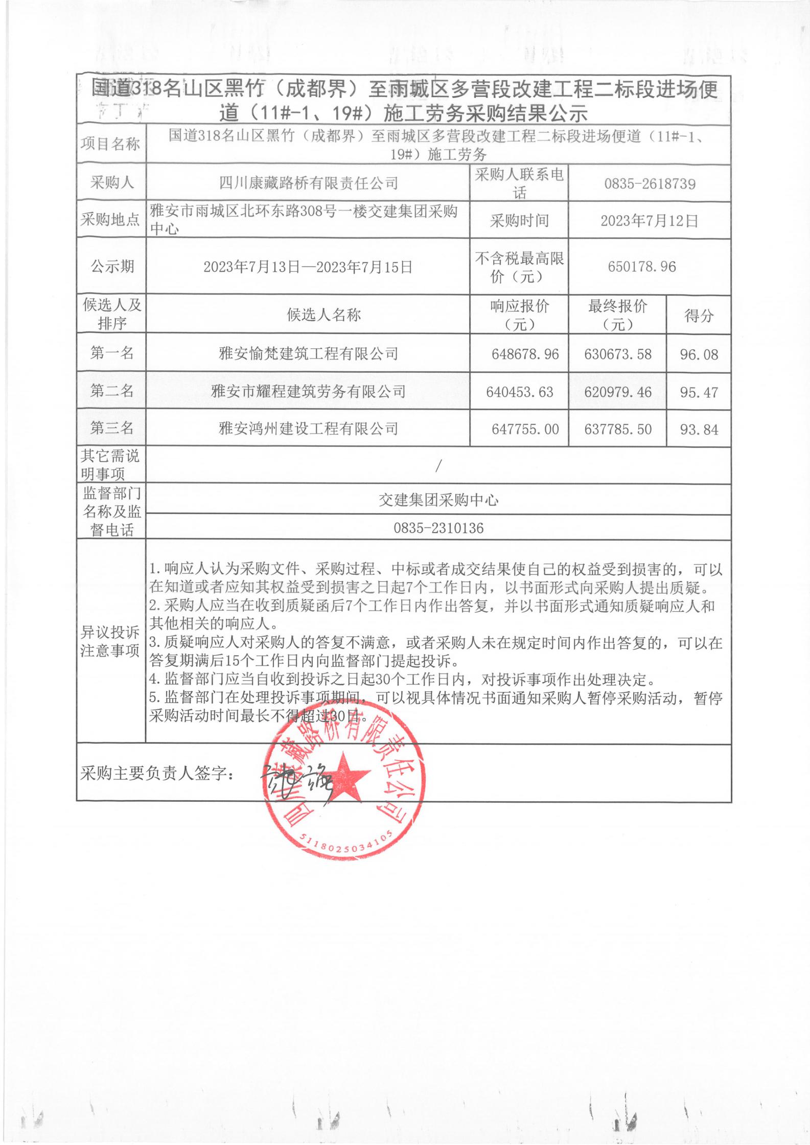 四川康藏路橋有限責(zé)任公司國道318名山區(qū)黑竹(成都界)至雨城區(qū)多營段改建工程二標(biāo)段進(jìn)場(chǎng)便道(11#-1、19#)施工勞務(wù)采購結(jié)果公示
