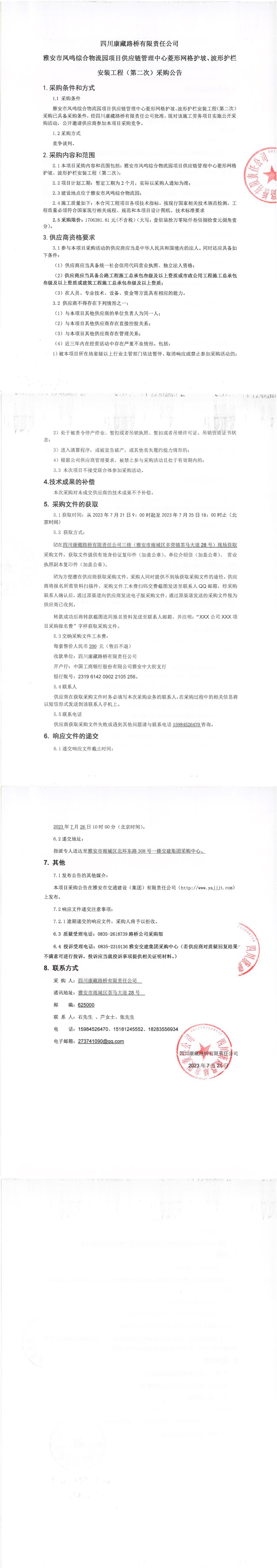 四川康藏路橋有限責任公司雅安市鳳鳴綜合物流園項目供應(yīng)鏈管理中心菱形網(wǎng)格護坡、波形護欄安裝工程(第二次)采購公告