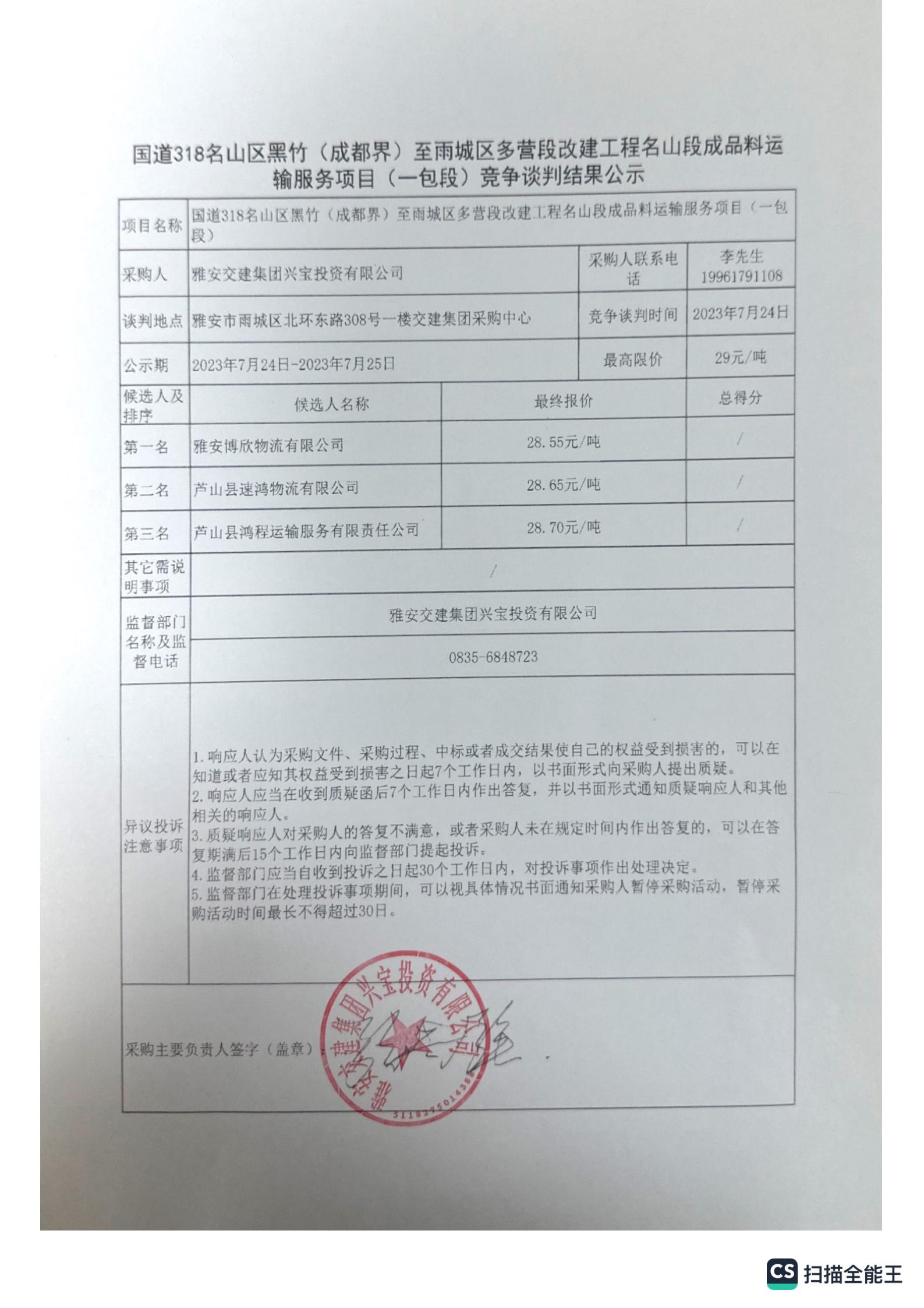 雅安交建集團(tuán)興寶投資有限公司國道318名山區(qū)黑竹(成都界)至雨城區(qū)多營段改建工程名山段成品料運(yùn)輸服務(wù)項(xiàng)目(一包段)競爭談判結(jié)果公示