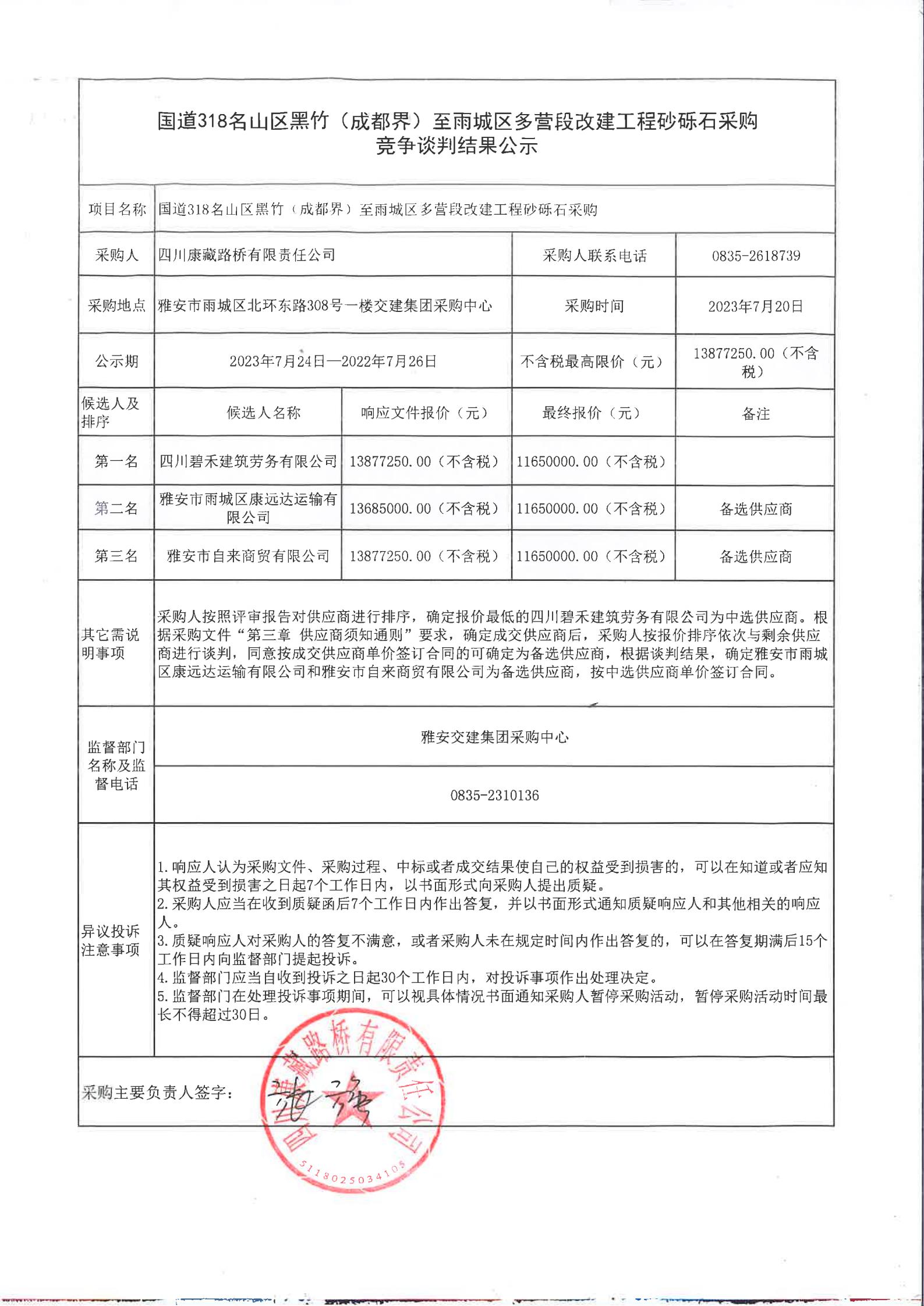 四川康藏路橋有限責(zé)任公司國道318名山區(qū)黑竹(成都界)至雨城區(qū)多營段改建工程砂礫石采購競爭談判結(jié)果公示