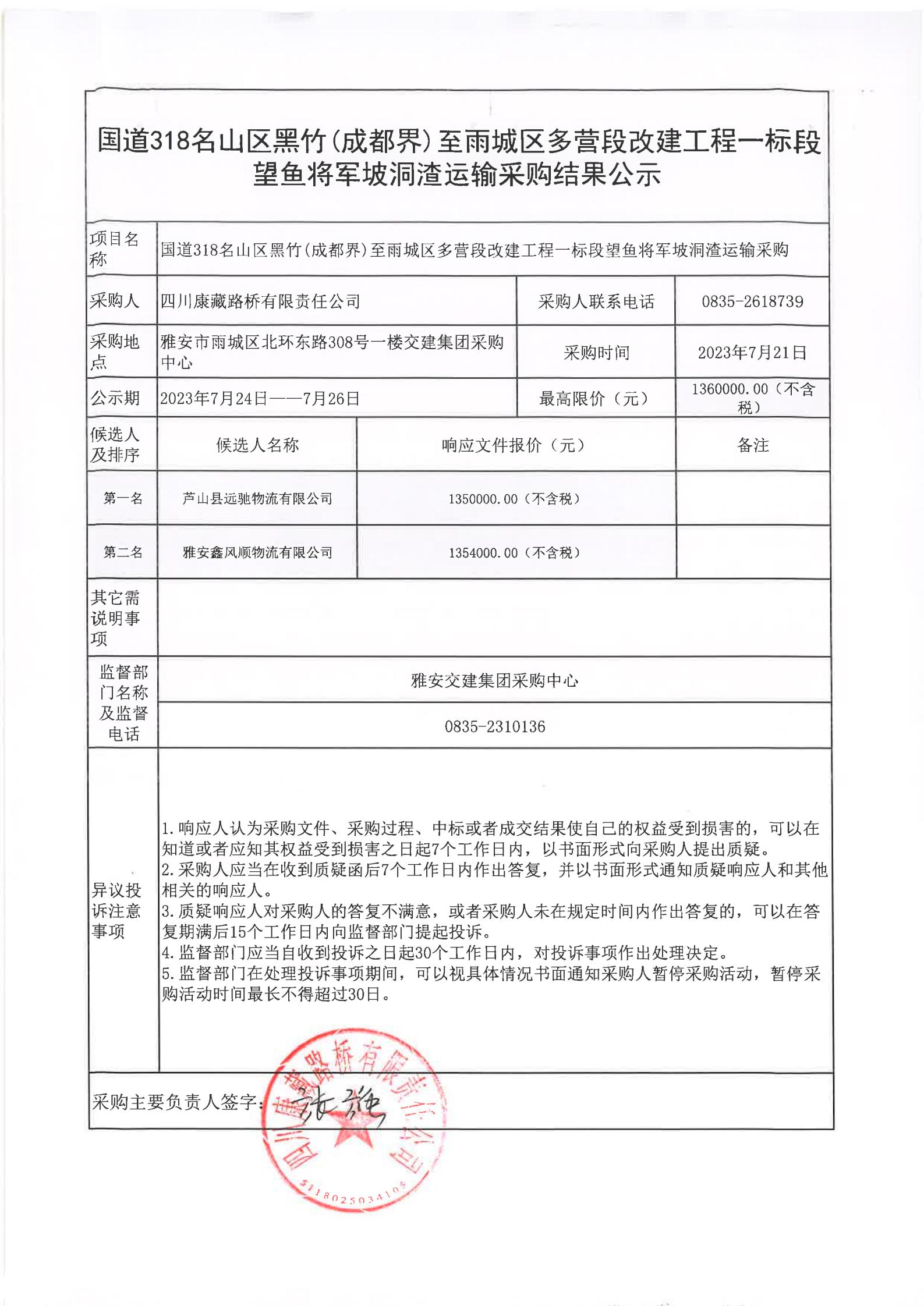 四川康藏路橋有限責任公司國道318名山區(qū)黑竹(成都界)至雨城區(qū)多營段改建工程一標段望魚將軍坡洞渣運輸采購結(jié)果公示