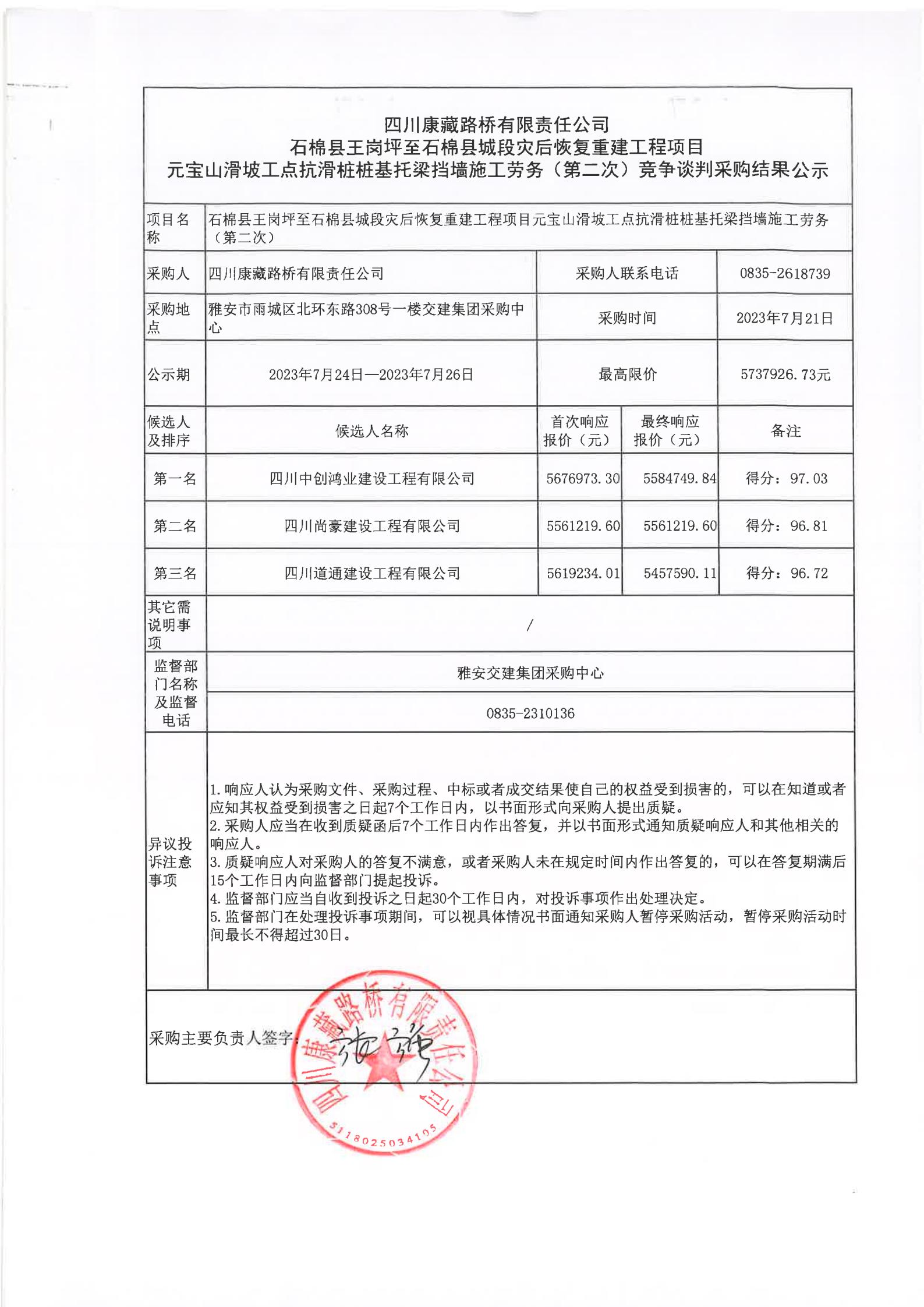 四川康藏路橋有限責任公司石棉縣王崗坪至石棉縣城段災后恢復重建工程項目元寶山滑坡工點抗滑樁樁基托梁擋墻施工勞務(wù)(第二次)競爭談判采購結(jié)果公示