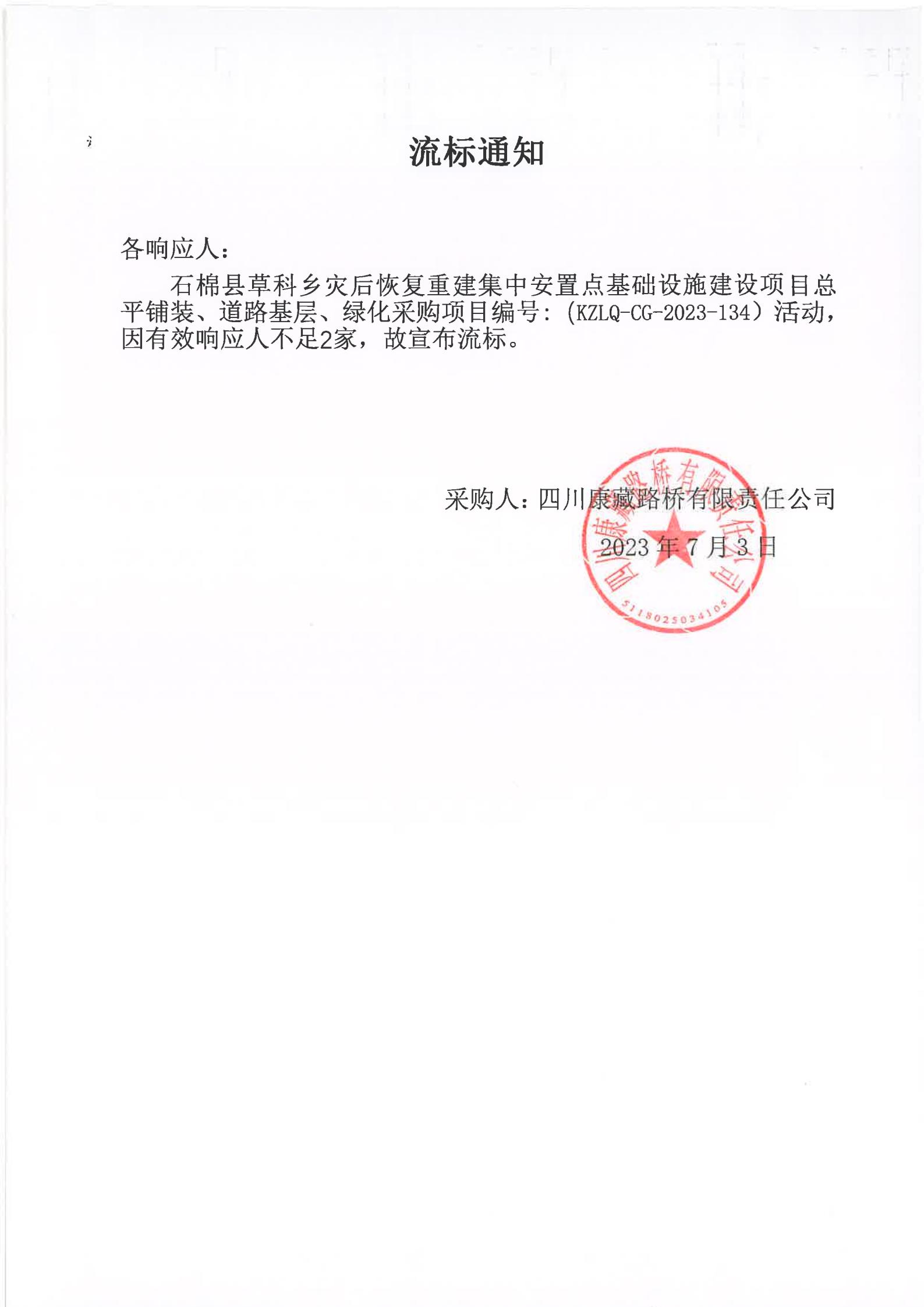 四川康藏路橋有限責任公司石棉縣草科鄉(xiāng)災(zāi)后恢復(fù)重建集中安置點基礎(chǔ)設(shè)施建設(shè)項目總平鋪裝、道路基層、綠化采購流標通知