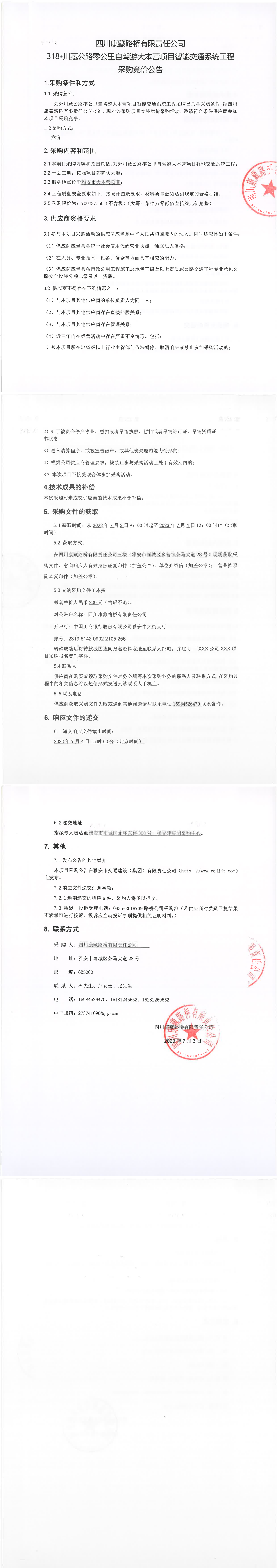 四川康藏路橋有限責任公司318·川藏公路零公里自駕游大本營項目智能交通系統(tǒng)工程采購競價公告