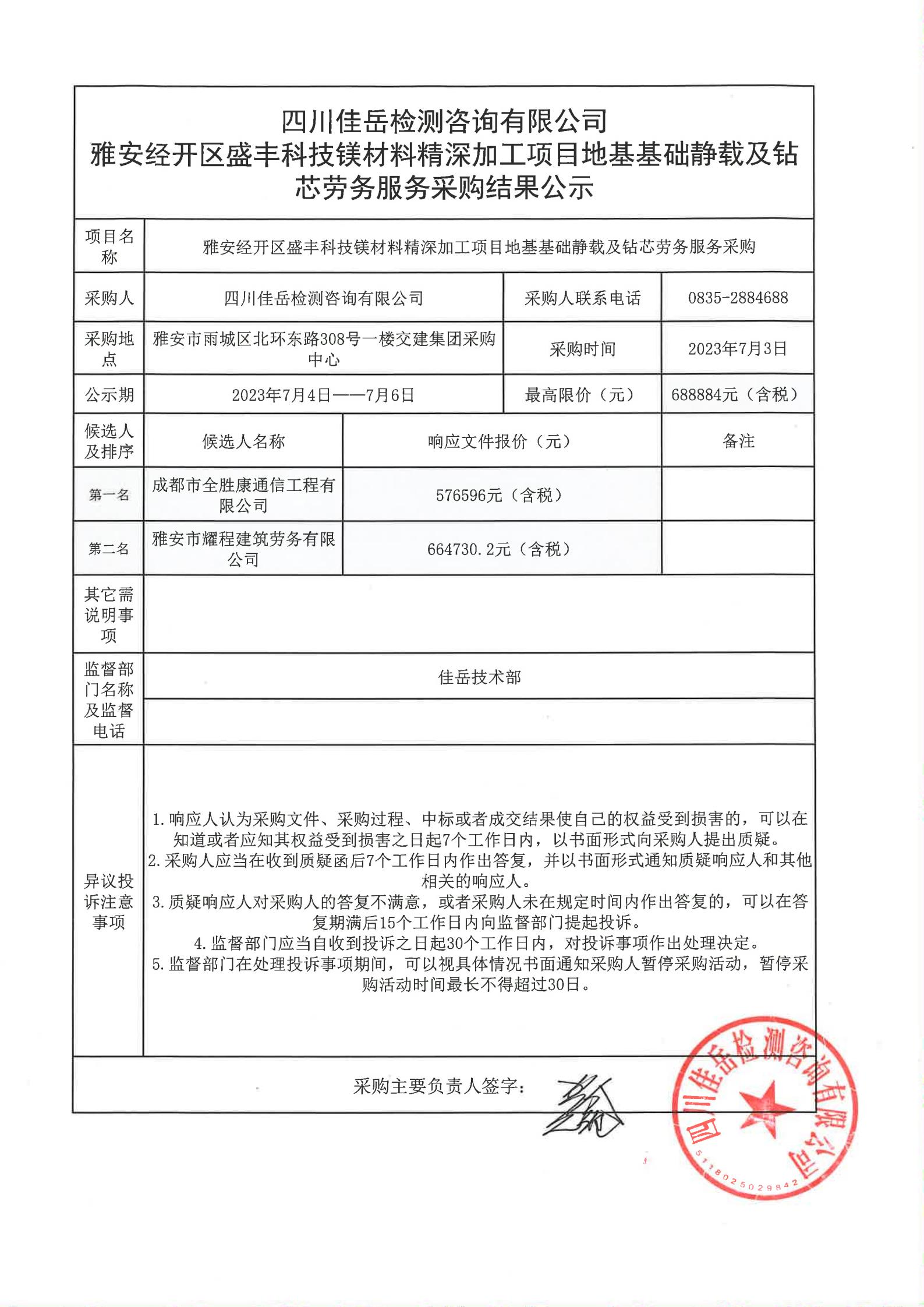 四川佳岳檢測咨詢有限公司雅安經(jīng)開區(qū)盛豐科技鎂材料精深加工項目地基基礎靜載及鉆芯服務采購結果公示