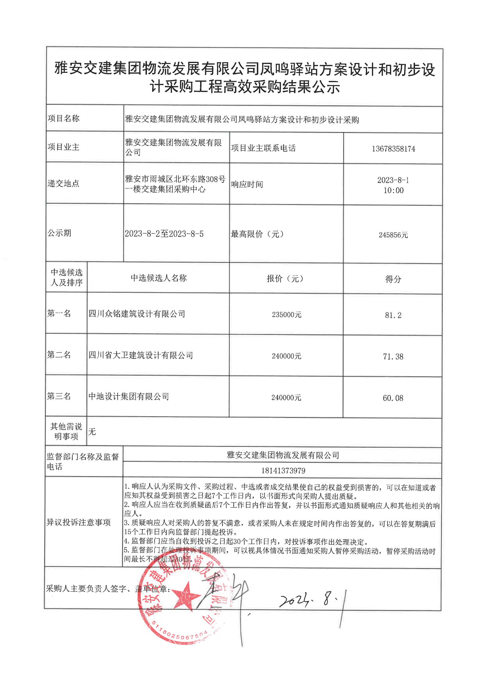 雅安交建集團(tuán)物流發(fā)展有限公司鳳鳴驛站方案設(shè)計(jì)和初步設(shè)計(jì)采購工程高效采購結(jié)果公示