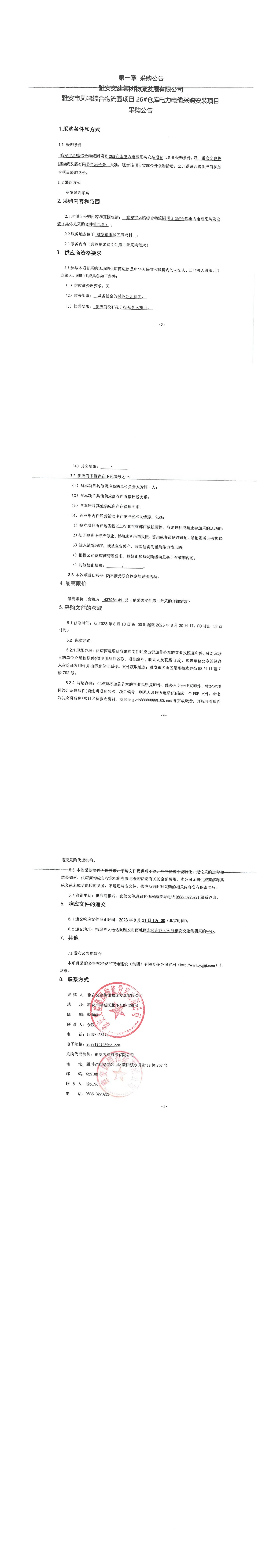 雅安交建集團(tuán)物流發(fā)展有限公司雅安市鳳鳴綜合物流園項(xiàng)目26#倉庫電力電纜采購安裝項(xiàng)目采購公告