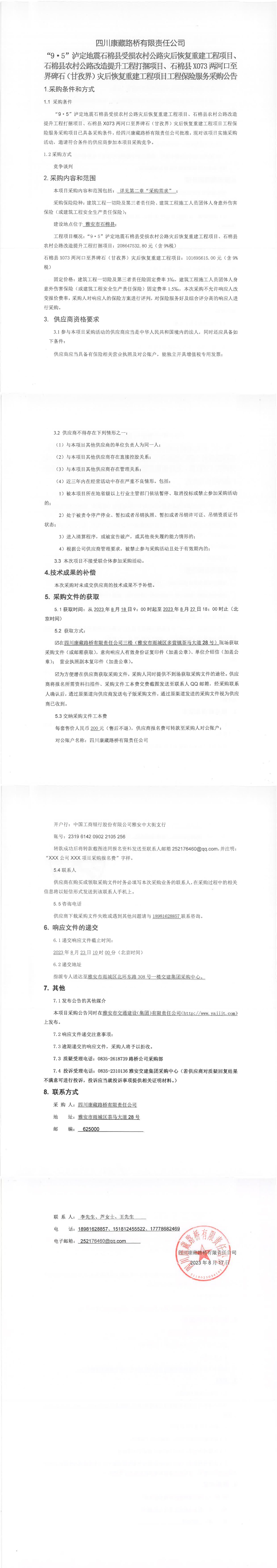 四川康藏路橋有限責任公司“9·5”瀘定地震石棉縣受損農村公路災后恢復重建工程項目、石棉縣農村公路改造提升工程打捆項目、石棉縣X073兩河口至界碑石(甘孜界)災后恢復重建工程項目工程保險服務采購公告