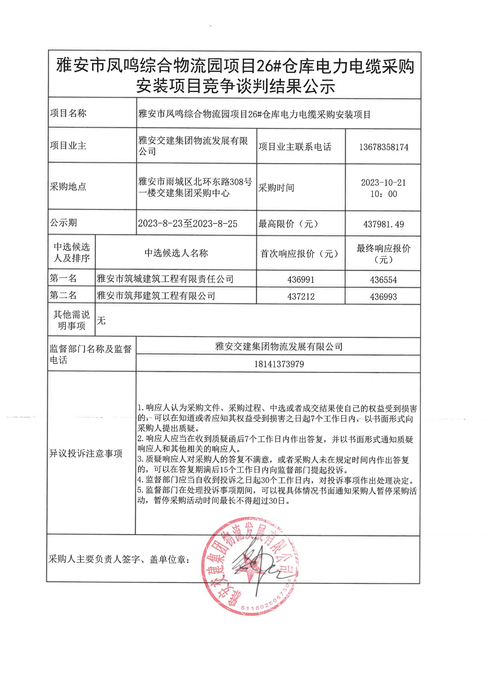 雅安交建集團(tuán)物流發(fā)展有限公司雅安市鳳鳴綜合物流園項(xiàng)目26#倉庫電力電纜采購安裝項(xiàng)目競(jìng)爭(zhēng)談判結(jié)果公示