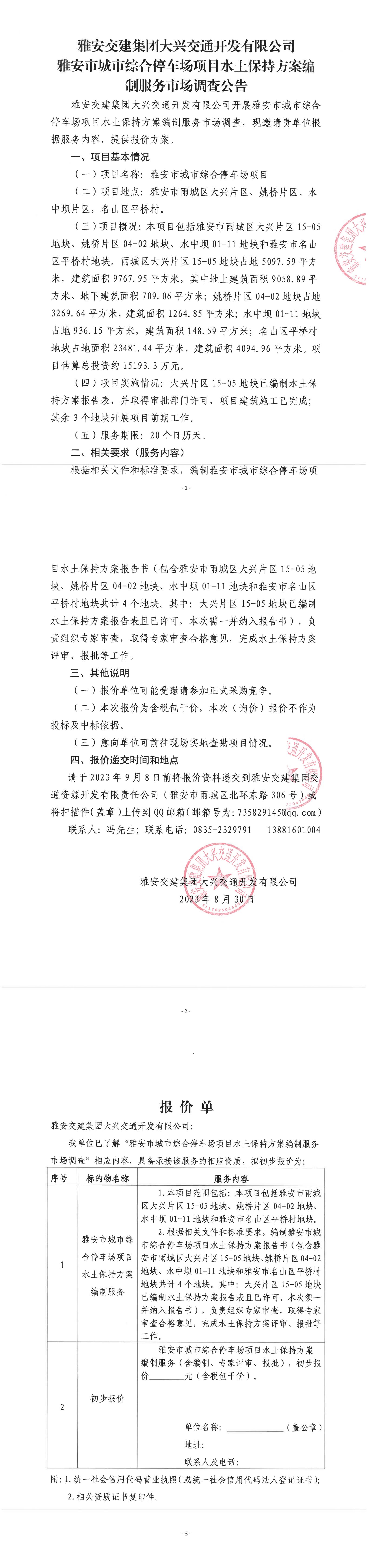雅安交建集團大興交通開發(fā)有限公司雅安市城市綜合停車場項目水土保持方案編制服務市場調(diào)查公告