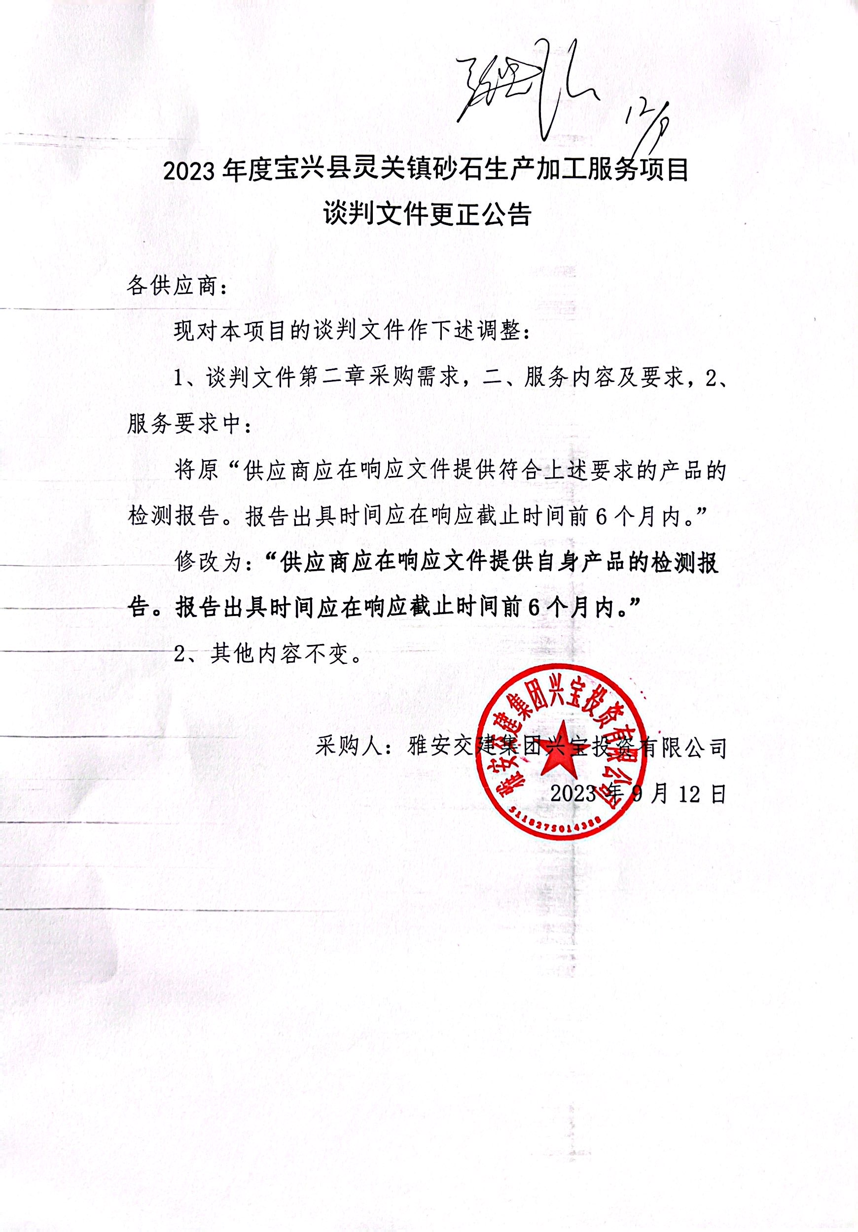 雅安交建集團興寶投資有限公司2023年度寶興縣靈關鎮(zhèn)砂石生產加工服務項目談判文件更正公告