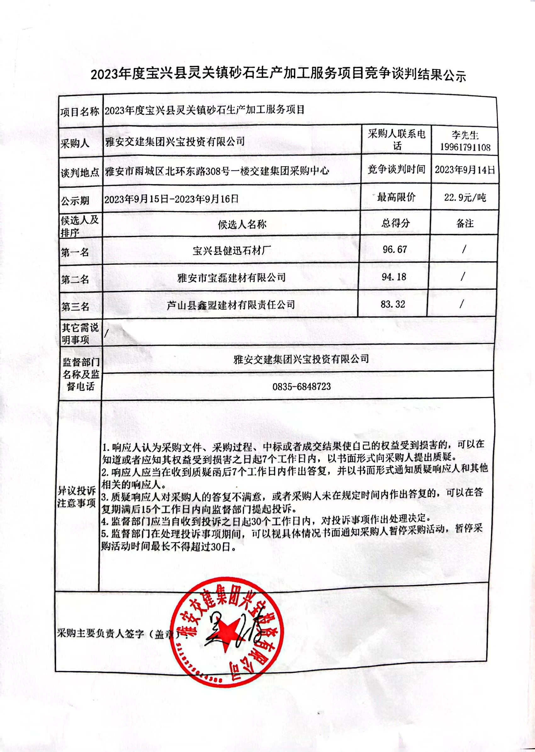 雅安交建集團(tuán)興寶投資有限公司2023年度寶興縣靈關(guān)鎮(zhèn)砂石生產(chǎn)加工服務(wù)項目競爭談判結(jié)果公示