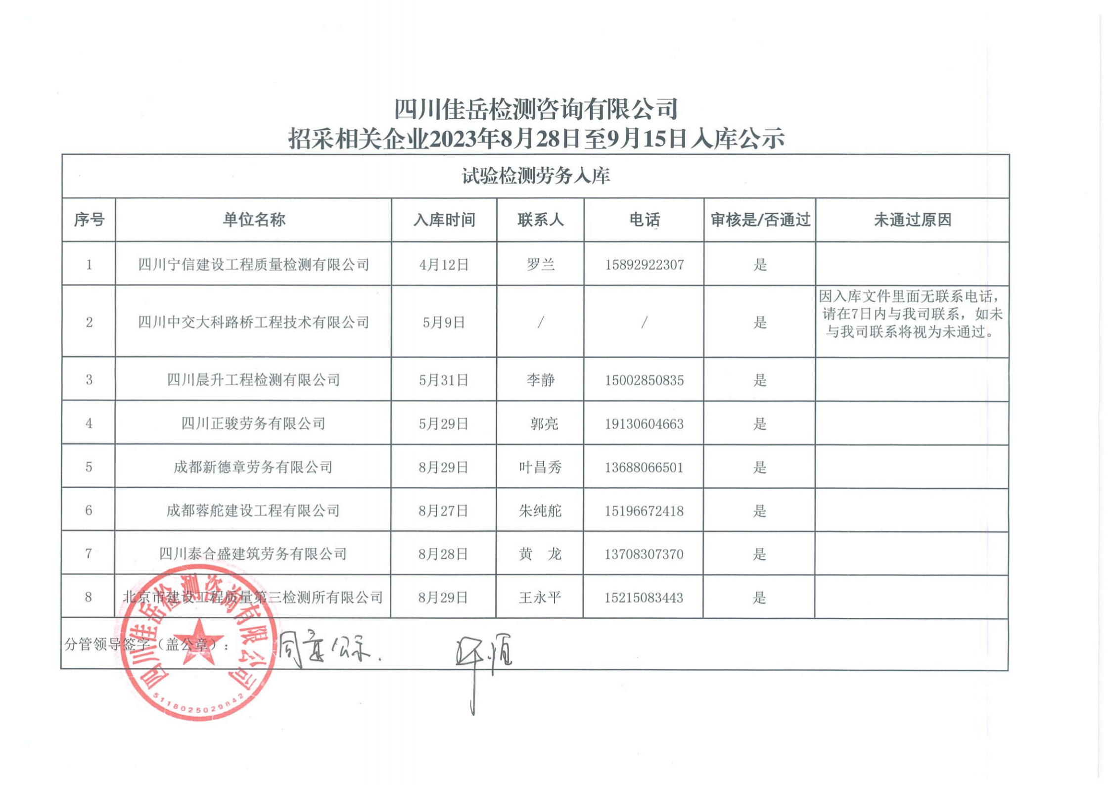 四川佳岳檢測(cè)咨詢有限公司招采相關(guān)企業(yè)2023年8月28日至9月15日入庫(kù)結(jié)果公示