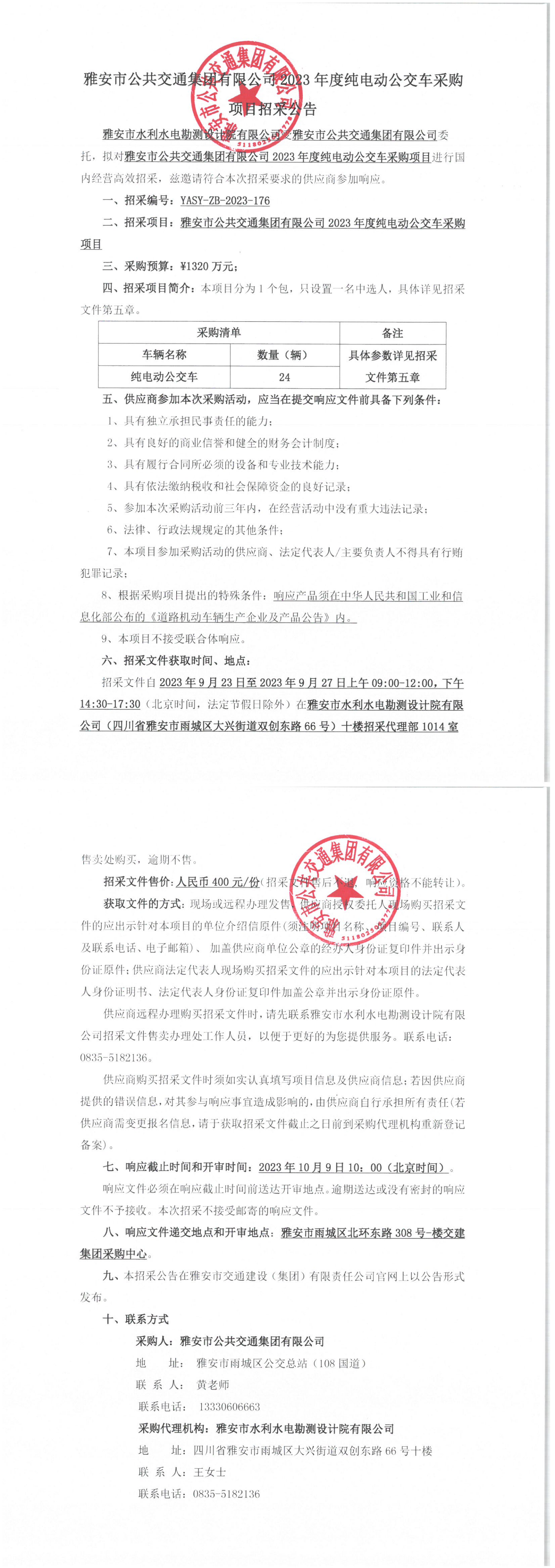 雅安市公共交通集團有限公司2023年度純電動車公交車采購項目招采公告