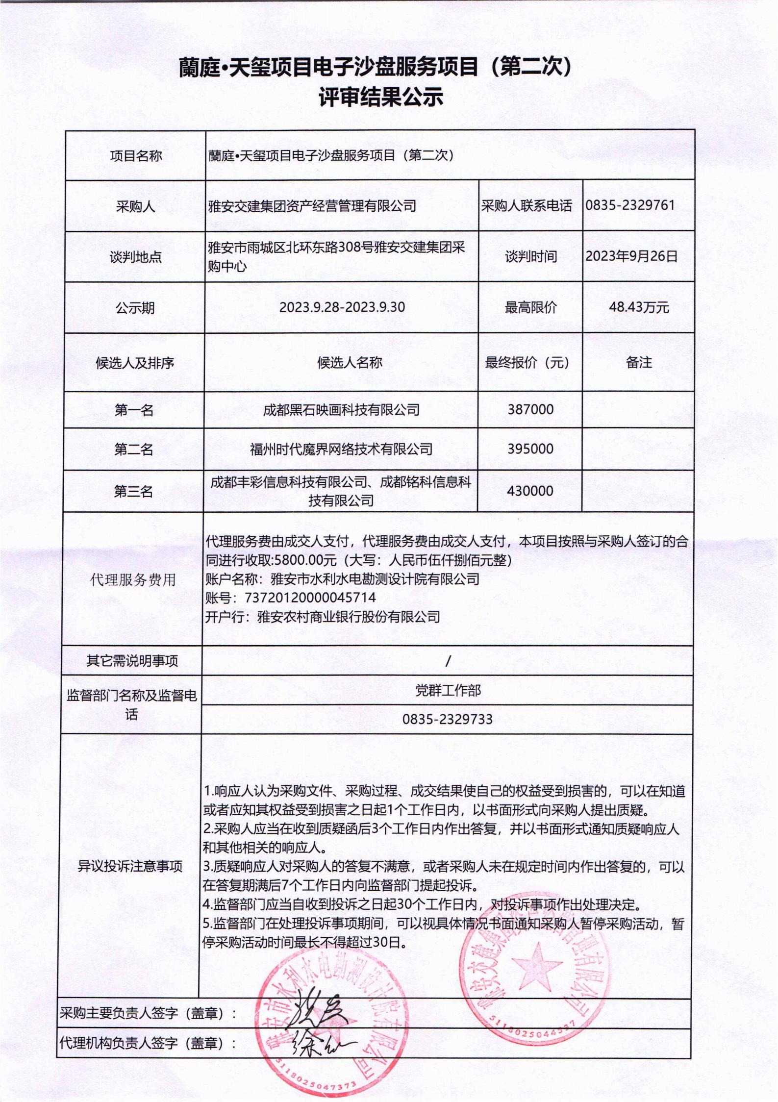 雅安交建集團資產經營管理有限公司蘭庭•天璽項目電子沙盤服務項目(第二次)評審結果公示