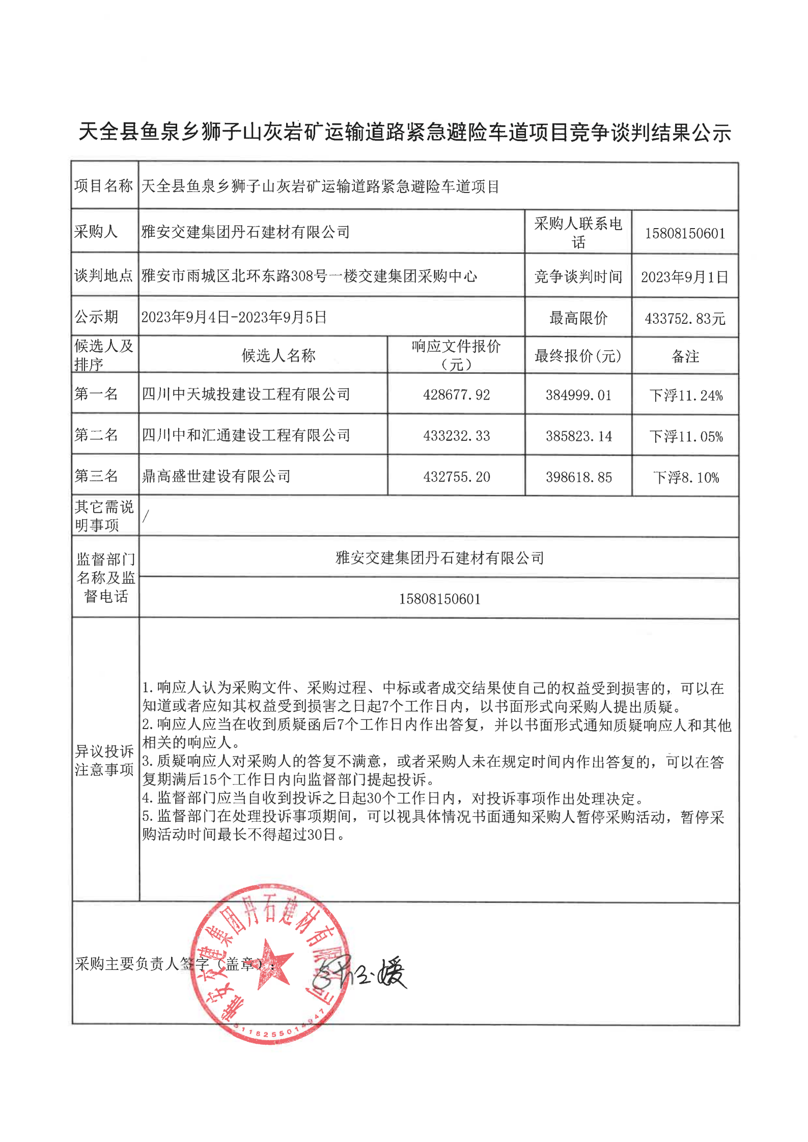 雅安交建集團(tuán)丹石建材有限公司天全縣魚(yú)泉鄉(xiāng)獅子山灰?guī)r礦運(yùn)輸?shù)缆肪o急避險(xiǎn)車(chē)道項(xiàng)目競(jìng)爭(zhēng)談判結(jié)果公示