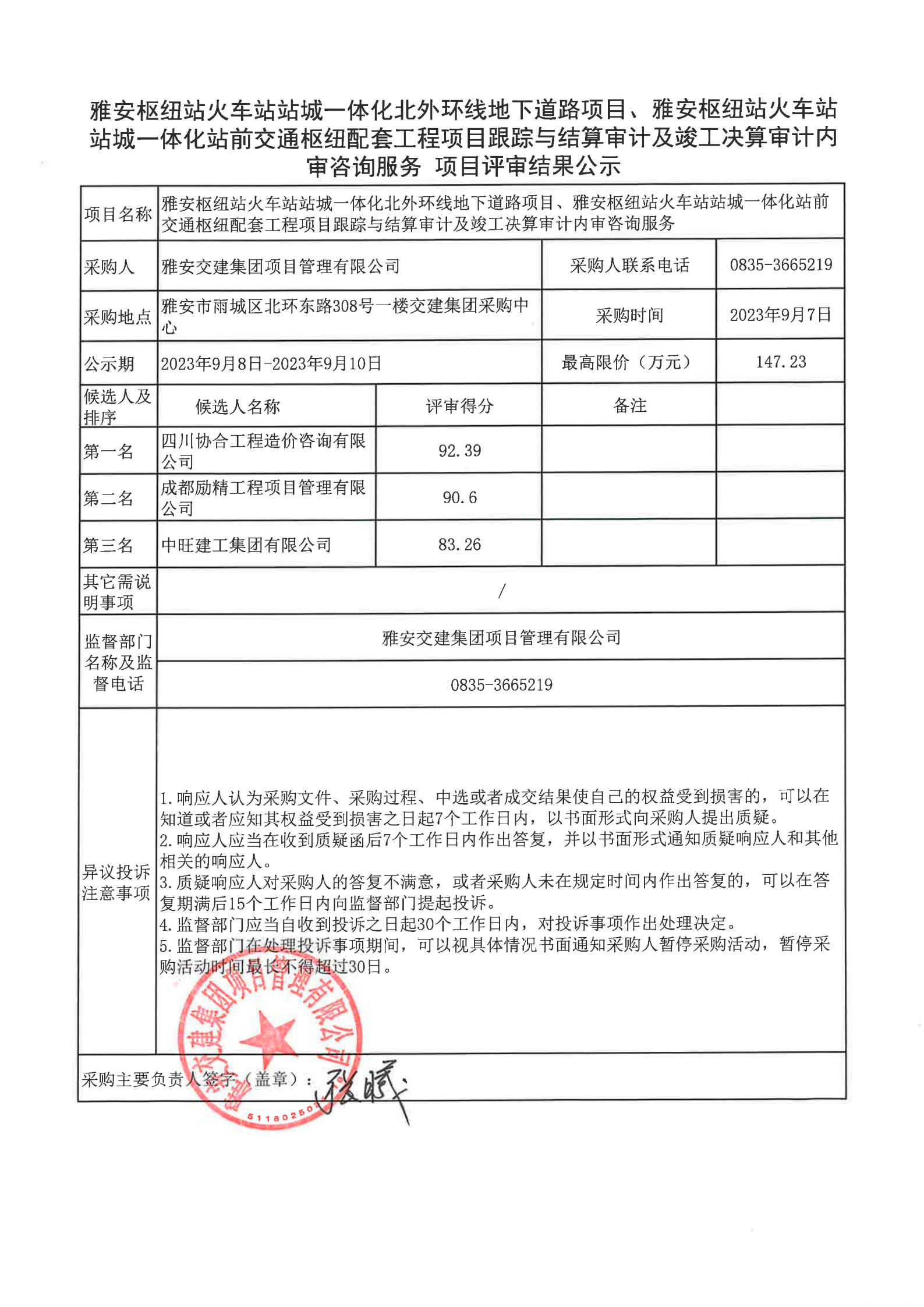 雅安交建集團(tuán)項(xiàng)目管理有限公司雅安樞紐站火車站站城一體化北外環(huán)線地下道路項(xiàng)目、樞紐站火車站站成一體化站前交通樞紐配套工程項(xiàng)目跟蹤與結(jié)算審計及竣工決算審計內(nèi)審咨詢服務(wù)項(xiàng)目評審結(jié)果公示