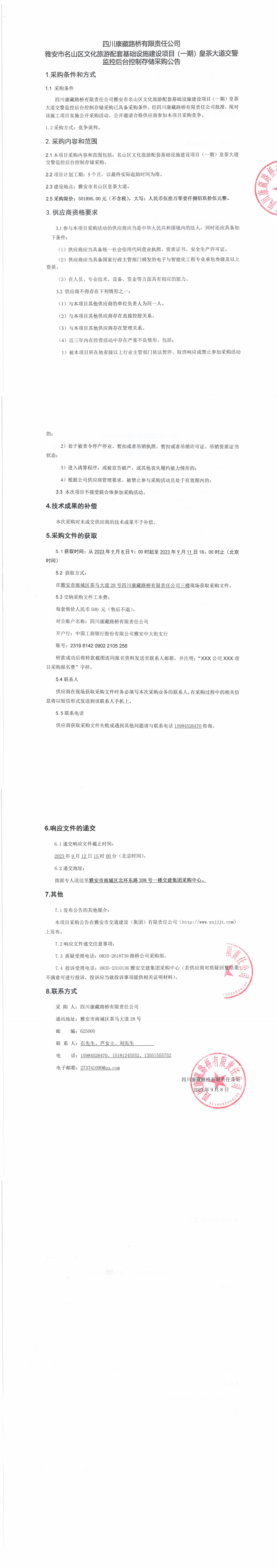 四川康藏路橋有限責(zé)任公司雅安市名山區(qū)文化旅游配套基礎(chǔ)設(shè)施建設(shè)項目(一期)皇茶大道交警監(jiān)控后臺控制存儲采購公告