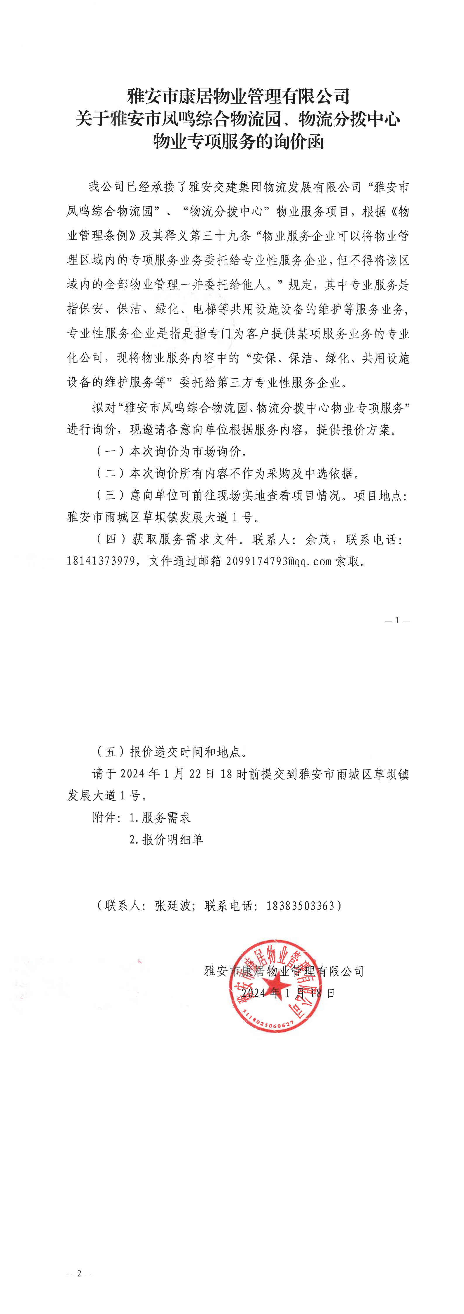 雅安市康居物業(yè)管理有限公司關(guān)于雅安市鳳鳴綜合物流園、物流分撥中心物業(yè)專項(xiàng)服務(wù)的詢價(jià)函