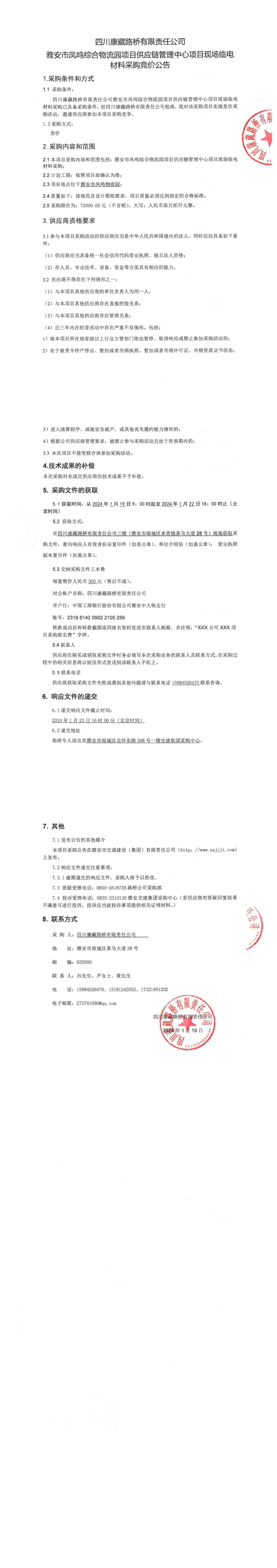 四川康藏路橋有限責(zé)任公司雅安市鳳鳴綜合物流園項(xiàng)目供應(yīng)鏈管理中心項(xiàng)目現(xiàn)場臨電材料采購競價(jià)公告