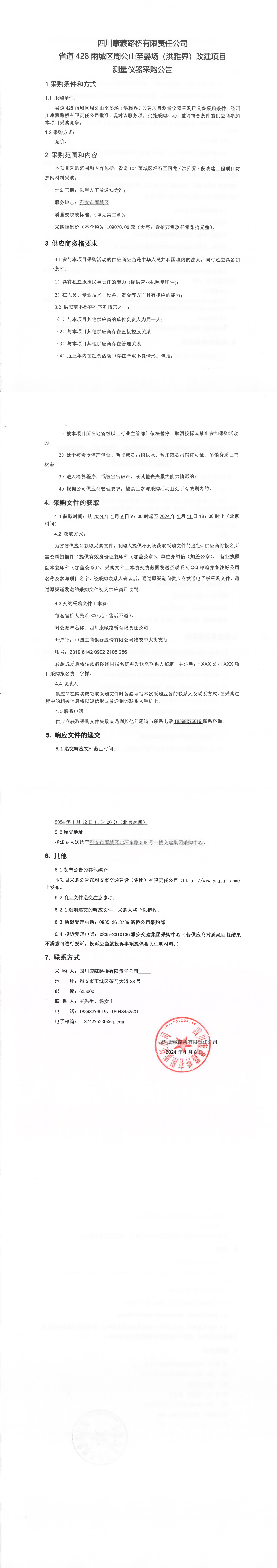 四川康藏路橋有限責(zé)任公司省道428雨城區(qū)周公山至晏場(洪雅界)改建項目測量儀器采購公告