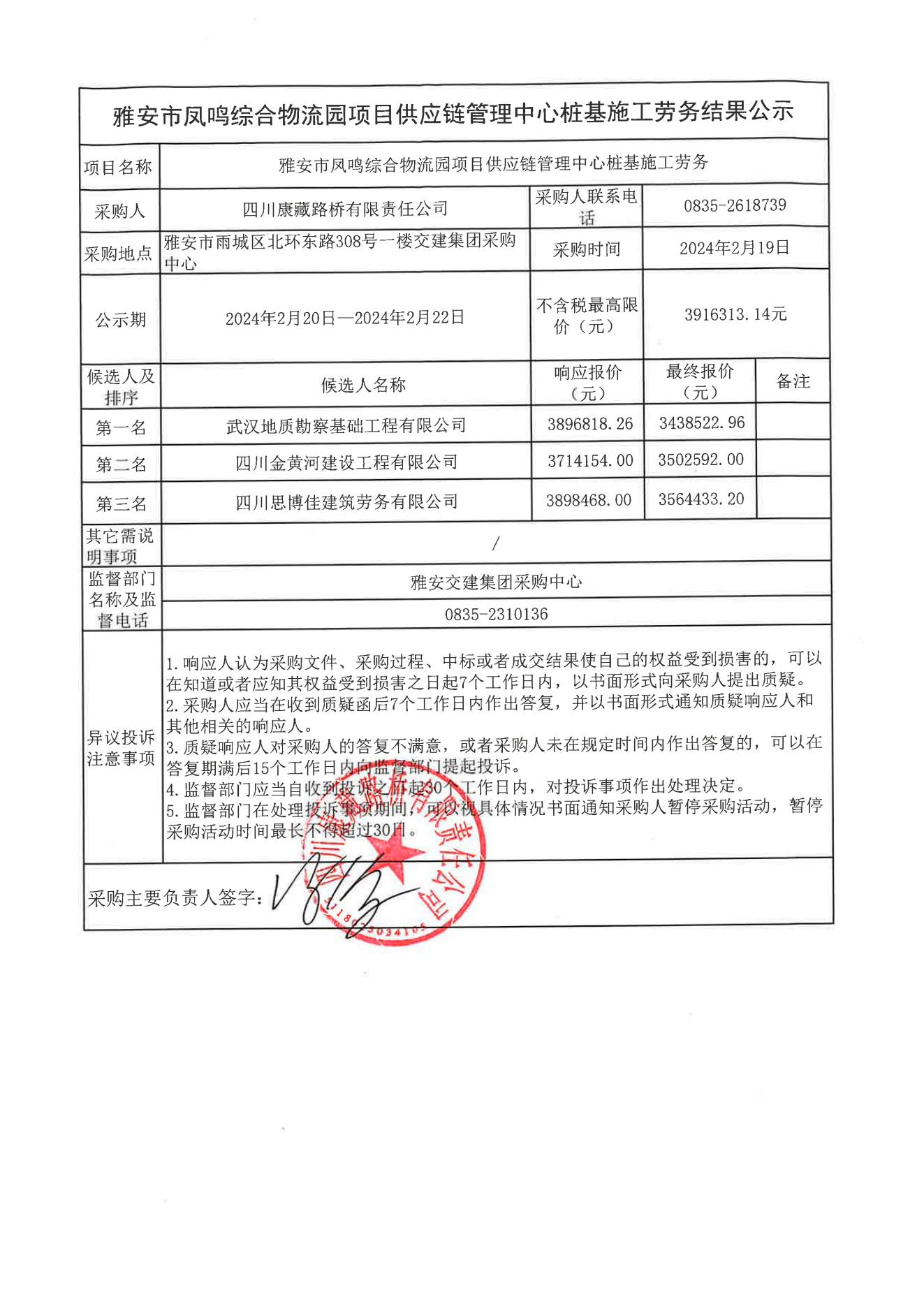 四川康藏路橋有限責任公司雅安市鳳鳴綜合物流園項目供應鏈管理中心樁基施工勞務結果公示