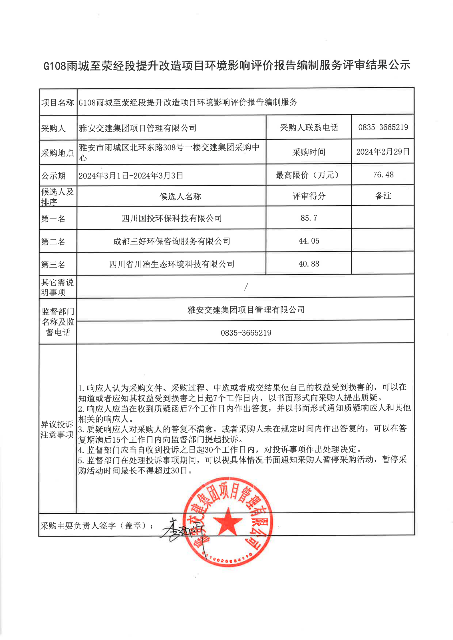 雅安交建集團項目管理有限公司G108雨城至滎經段提升改造項目環(huán)境影響評價報告編制服務評審結果公示