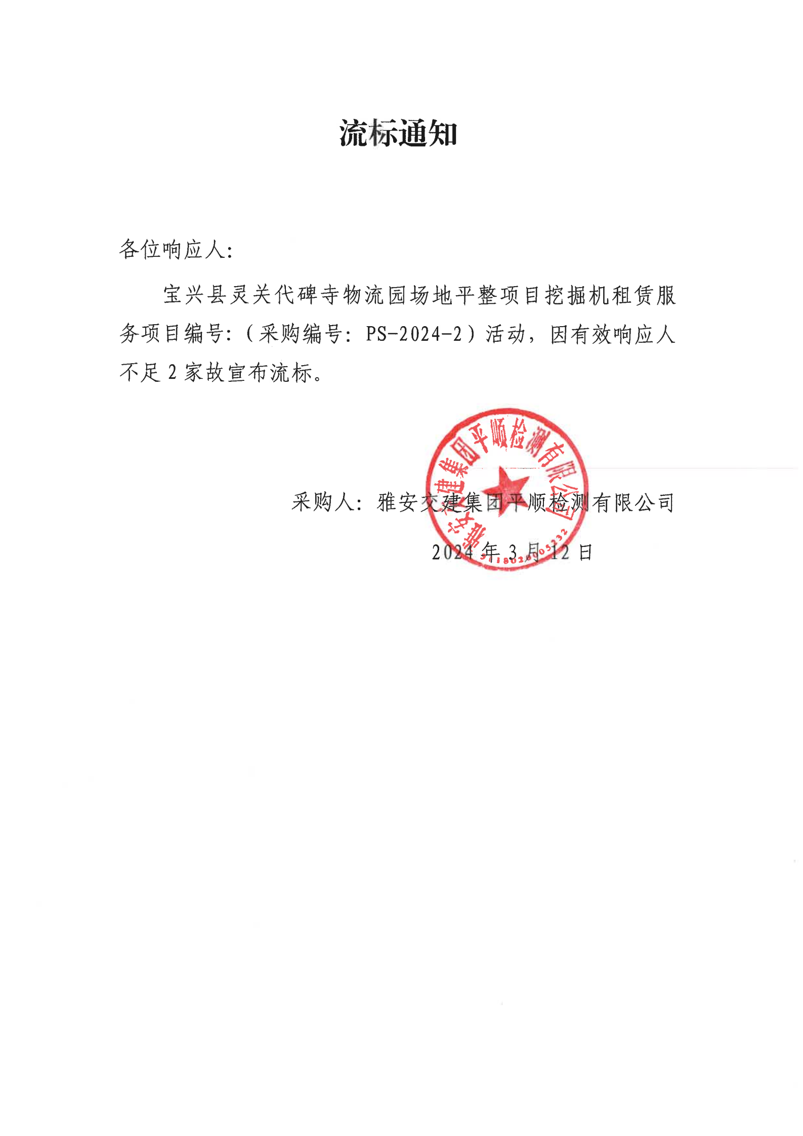 雅安交建集團(tuán)平順檢測有限公司寶興縣靈關(guān)代碑寺物流園場地平整項目挖掘機(jī)租賃服務(wù)流標(biāo)通知